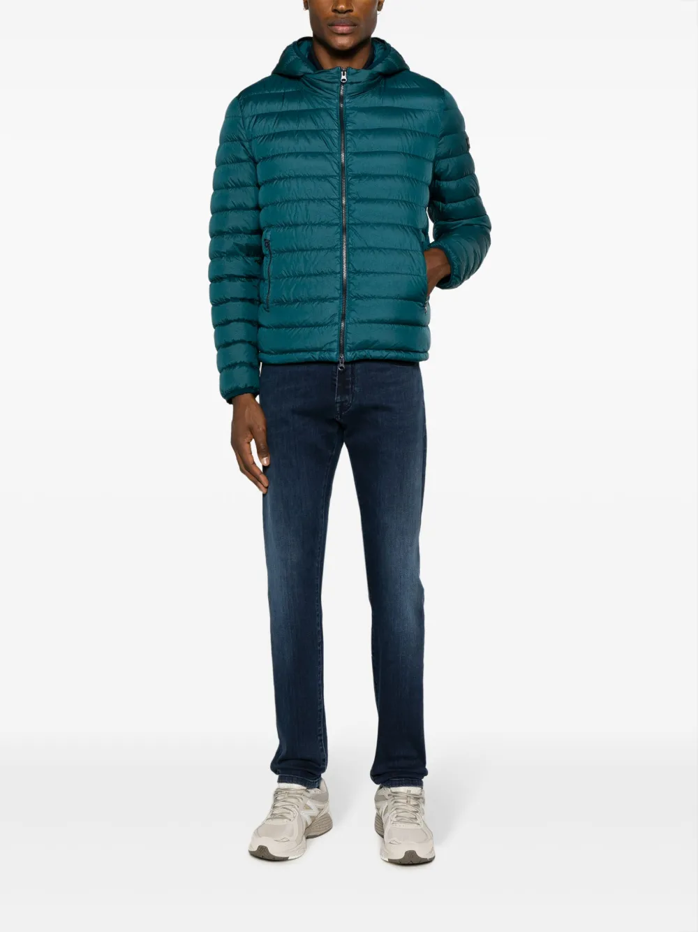 Кобальтово-синий, наполнитель из смеси пуха и пера, дутый материал, стеганая модель, нашивка с логотипом на рукаве, классический капюшон, застежка на молнии спереди, длинные рукава, два кармана на молнии по бокам и прямой подол.