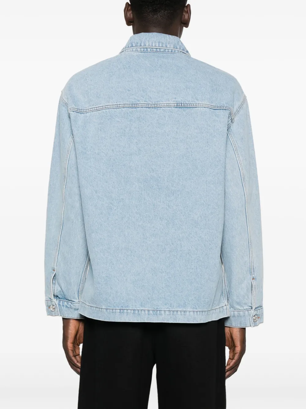 Голубой, хлопок, деним, принт граффити, классический воротник, двусторонняя молния спереди, два прорезных кармана сбоку, длинные рукава, манжеты на пуговицах и прямой подол.