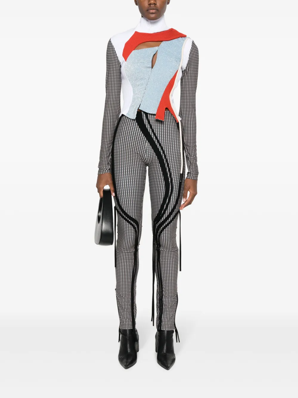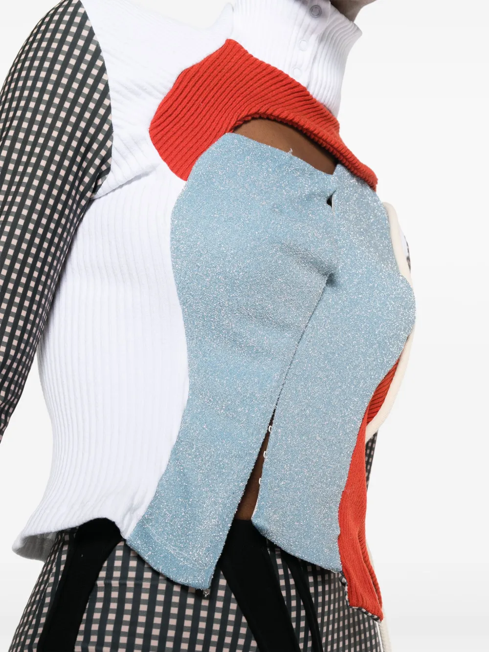 Синий, белый, красный, принт в клетку, вставки, высокий воротник, контрастные рукава, асимметричная модель, длинные рукава, вырезные детали, застежка на крючок, эффект металлик и прямой подол.