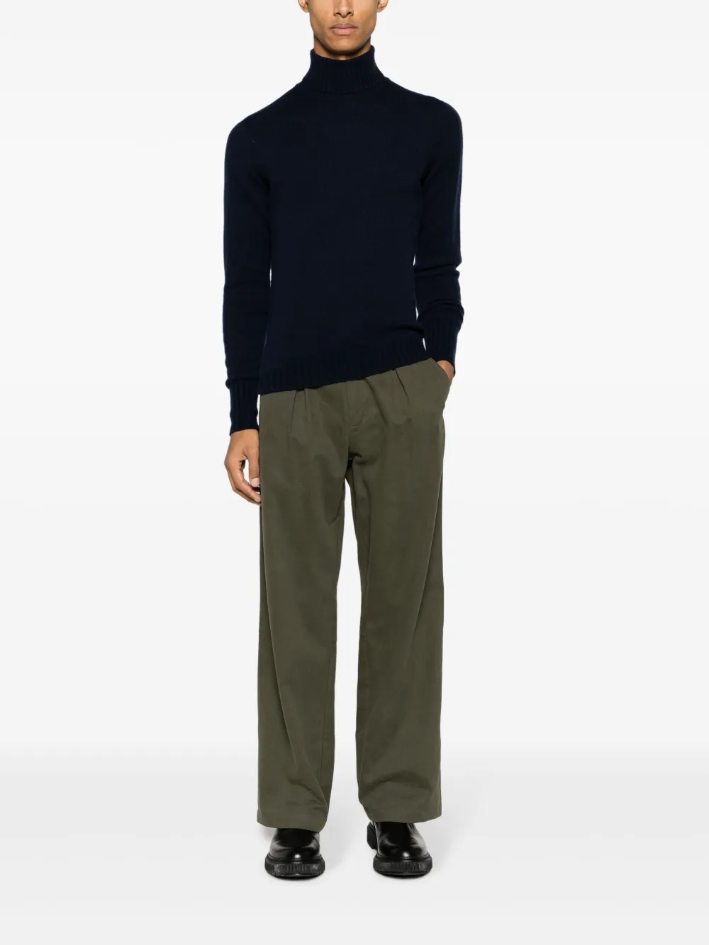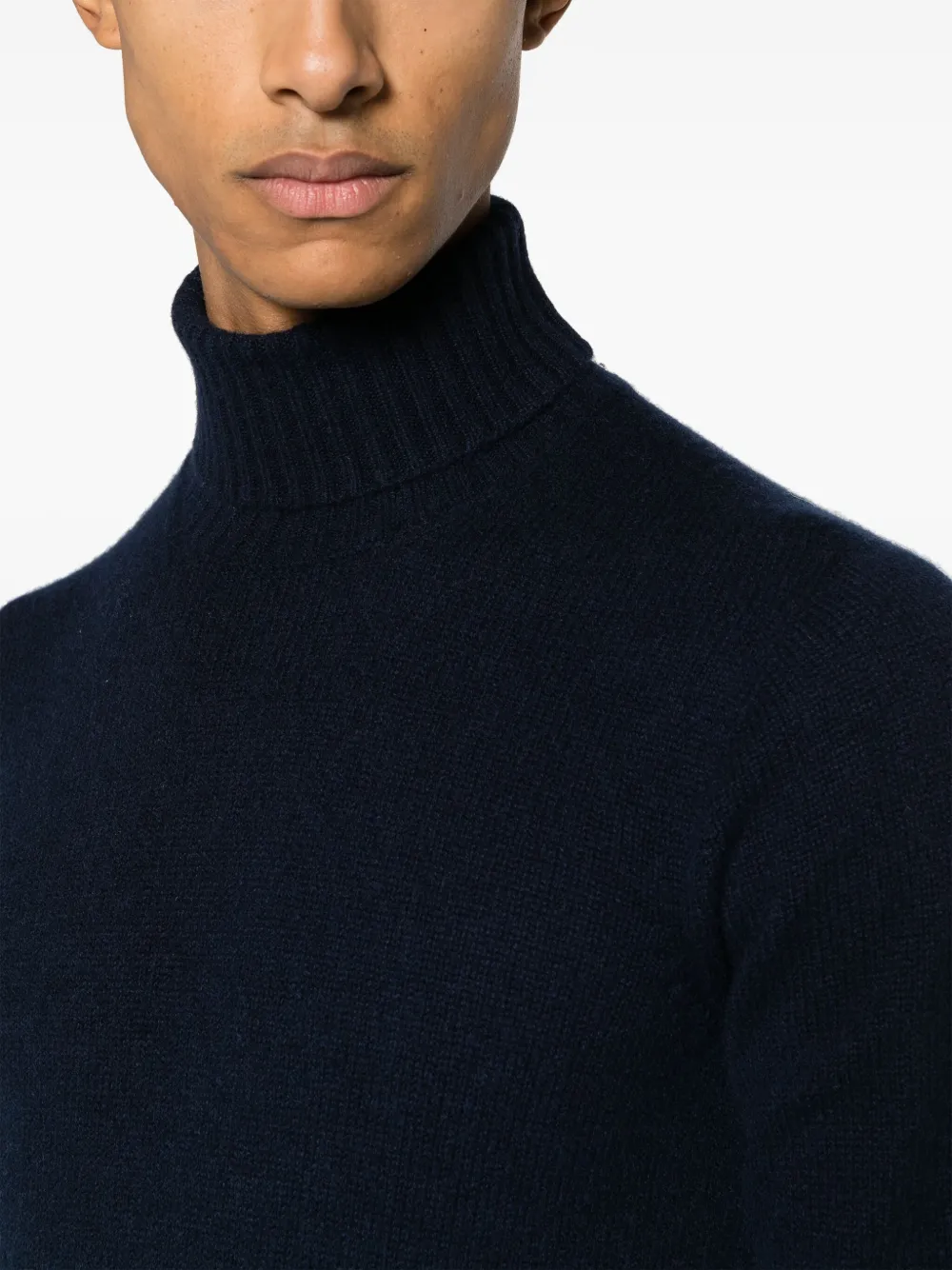 Темно-синий, кашемир, трикотажный материал, высокий воротник и длинные рукава.