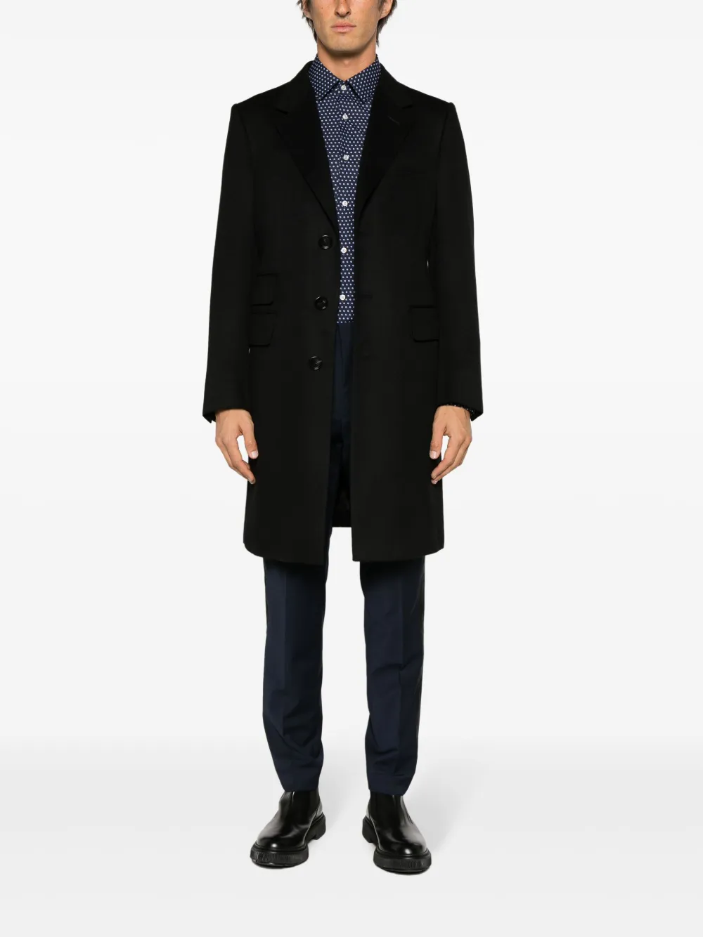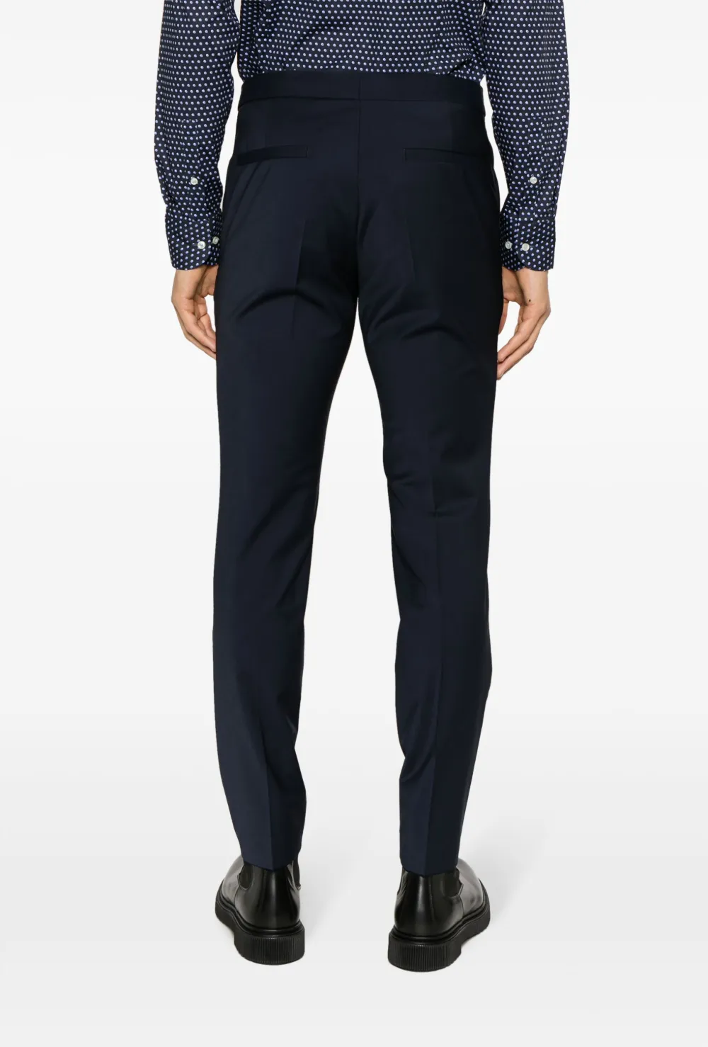 Темно-синий, смесовая необработанная шерсть, потайная застежка на молнии и пуговицах, два вшитых кармана по бокам, два прорезных кармана сзади, зауженный крой и прямой подол.