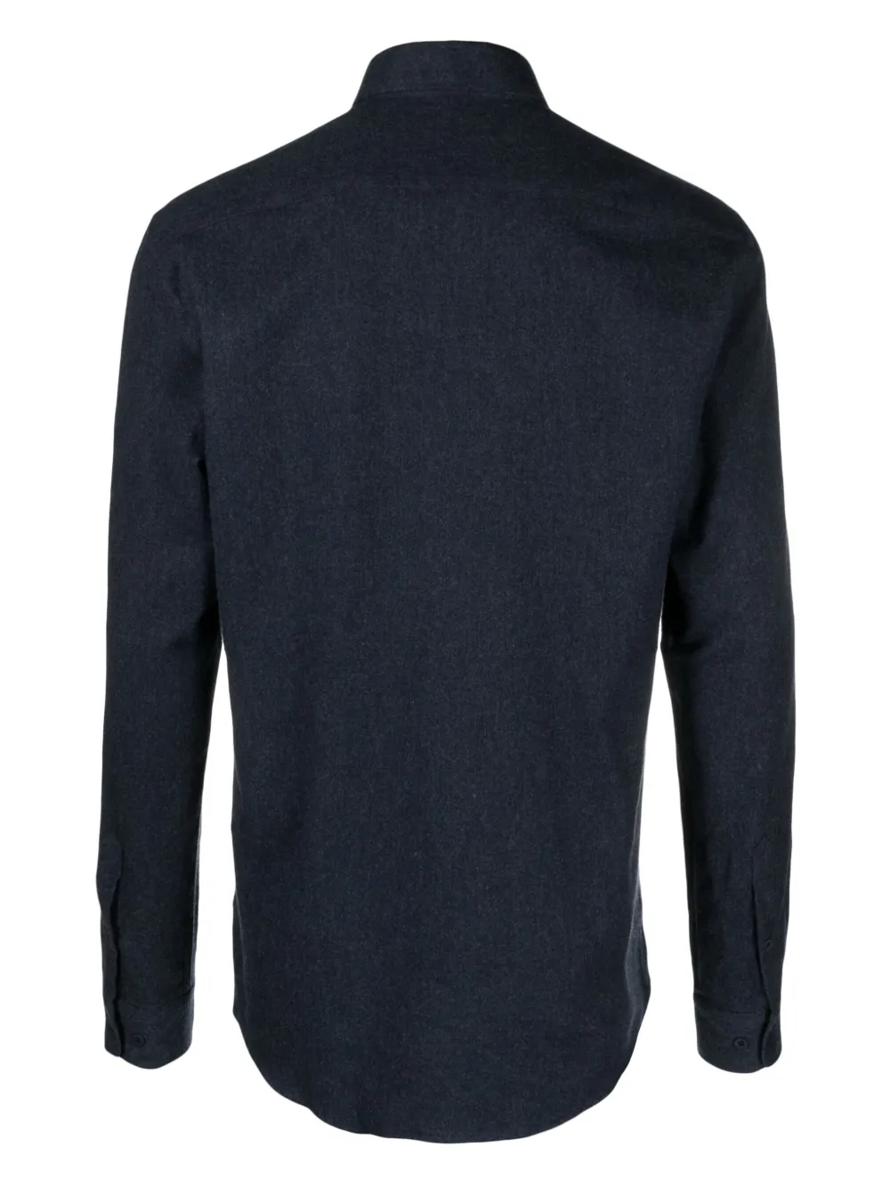 Темно-синий, хлопок, фланель, воротник на пуговицах, застежка на пуговицах спереди, длинные рукава, манжеты на пуговицах, нагрудный накладной карман и закругленный подол.