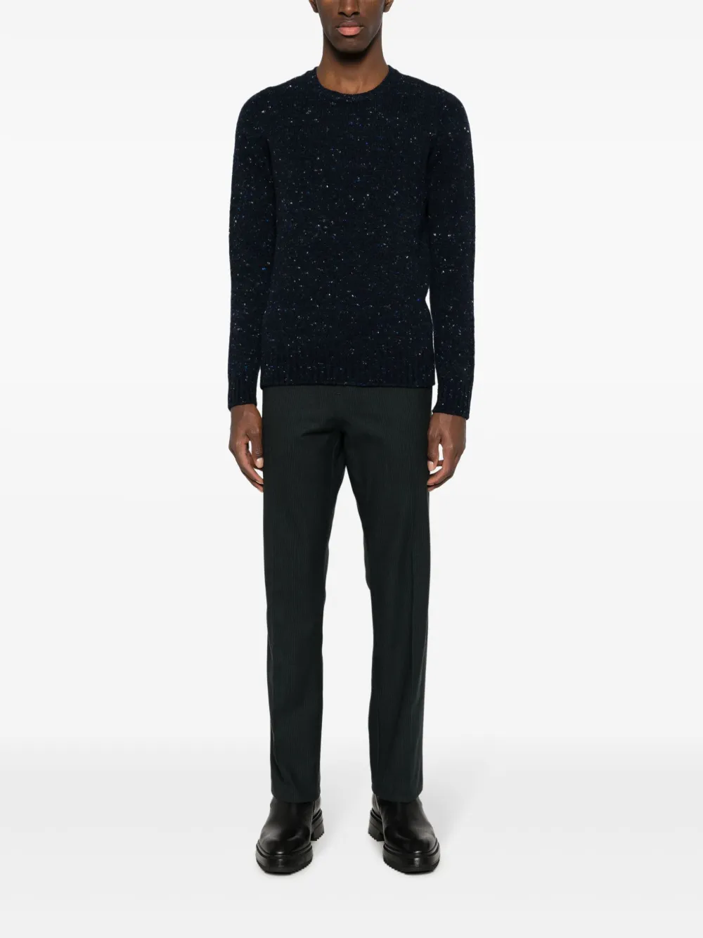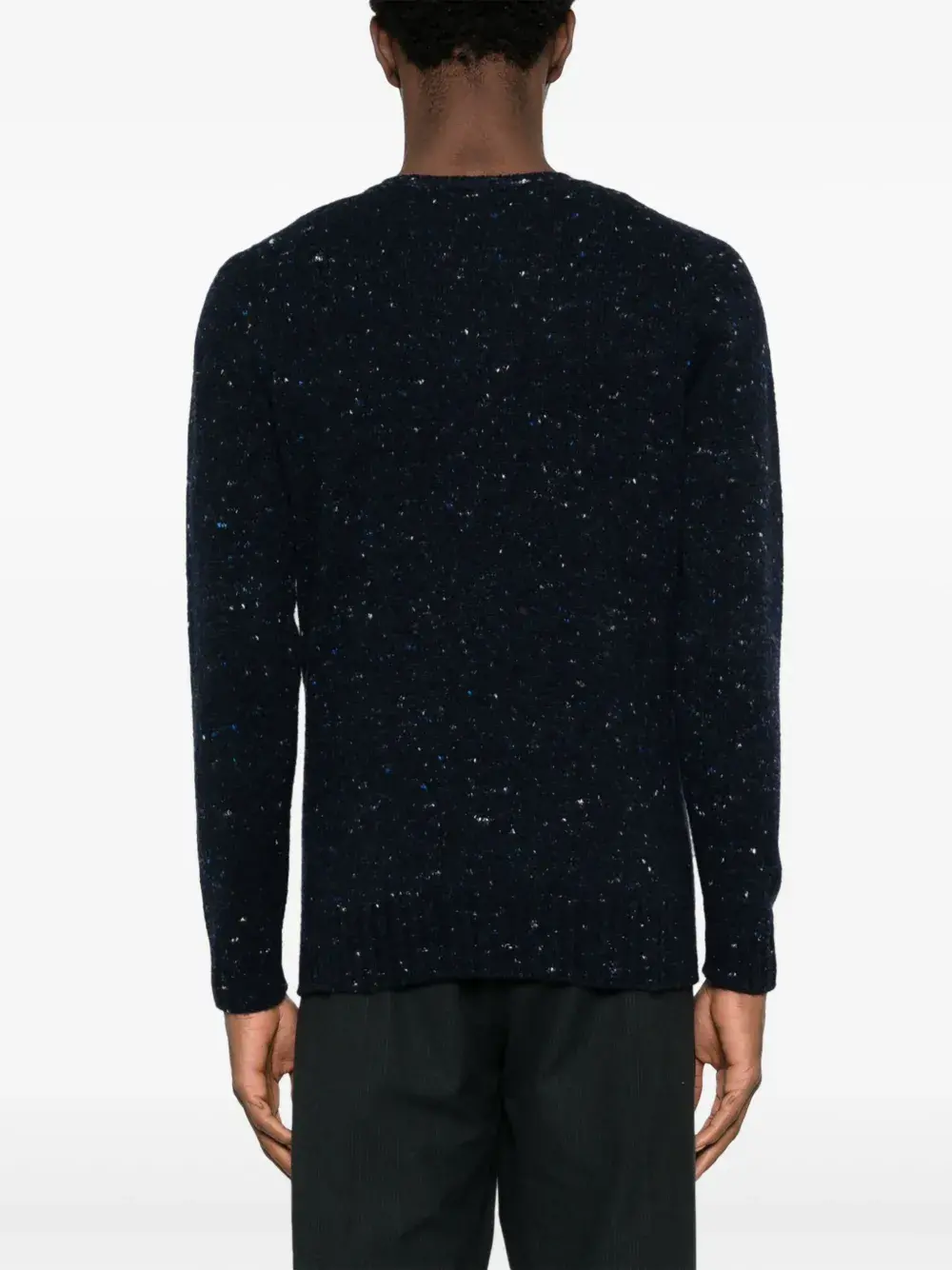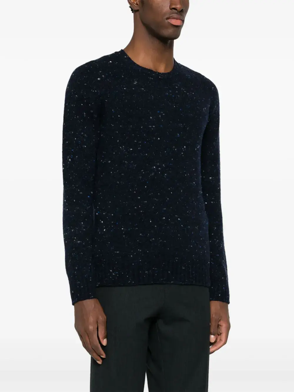 Темно-синий, смесь шерсти и кашемира, вязка с вкраплениями, круглый вырез, длинные рукава и прямой подол.