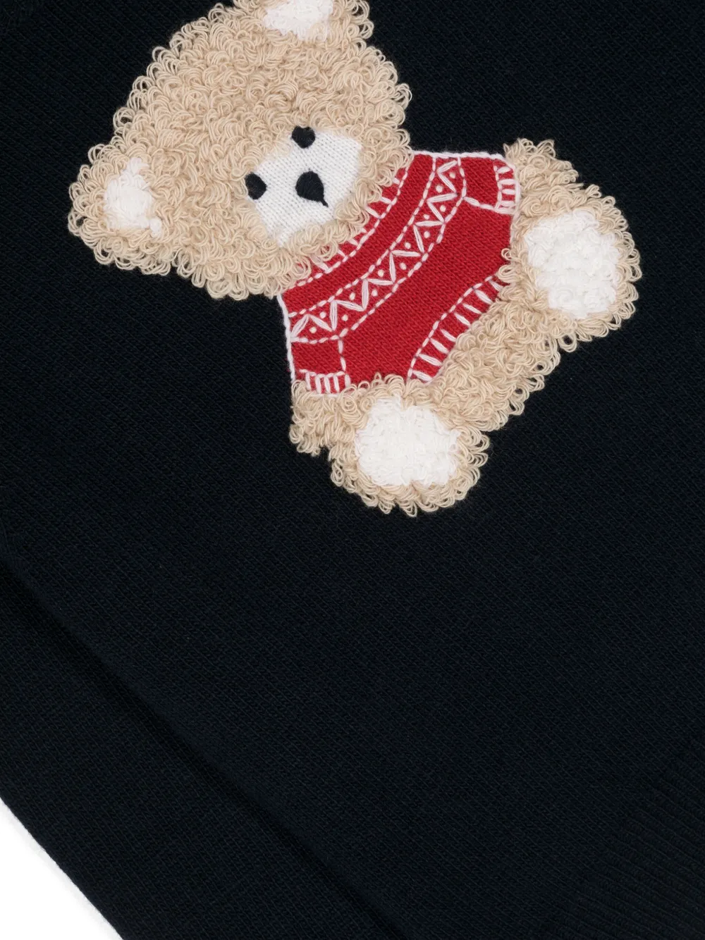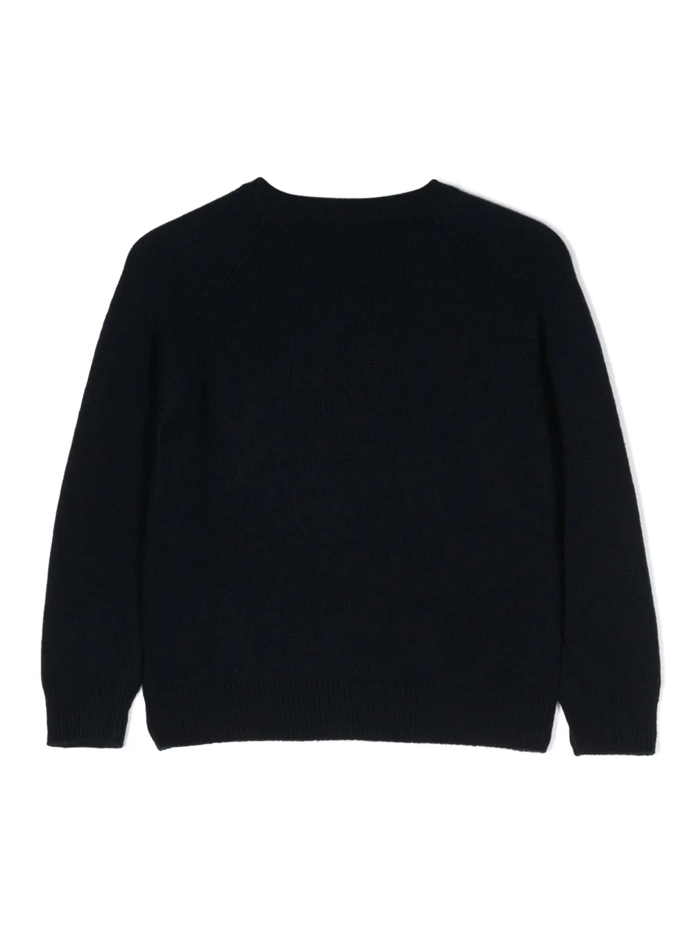 Темно-синий, необработанная шерсть, трикотажный материал, вязаные края в рубчик, материал 3D-knit, изображение медведя, вышитый узор, круглый вырез, длинные рукава реглан и прямой подол.