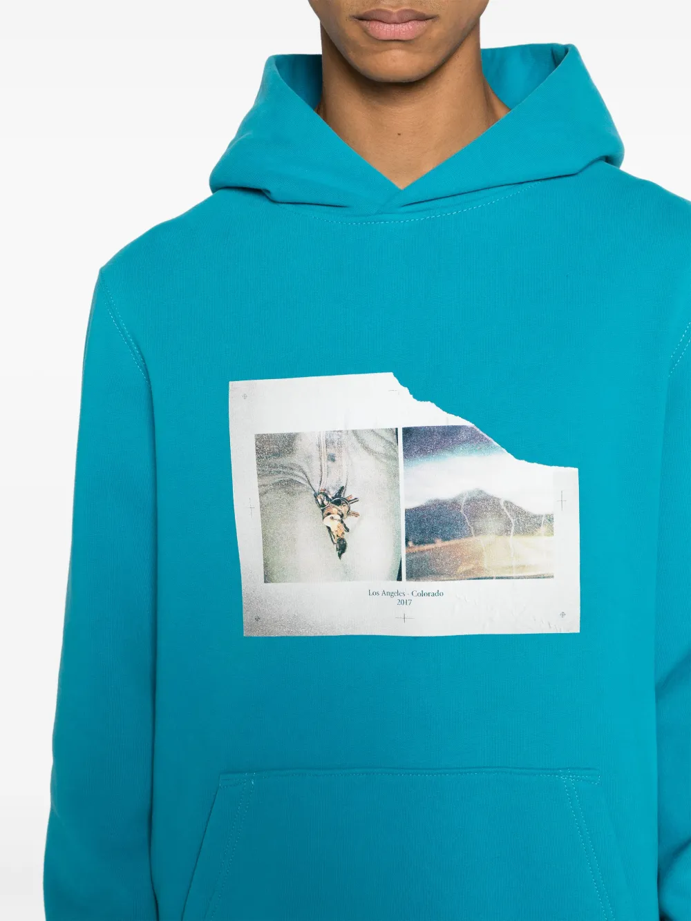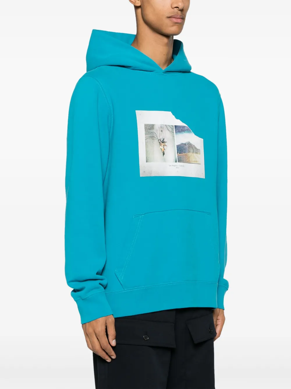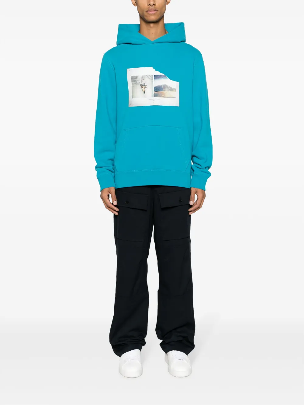 Синий, хлопок, фотопринт, текстовый принт, классический капюшон, карман-муфта, длинные рукава, флисовая подкладка и прямой подол.