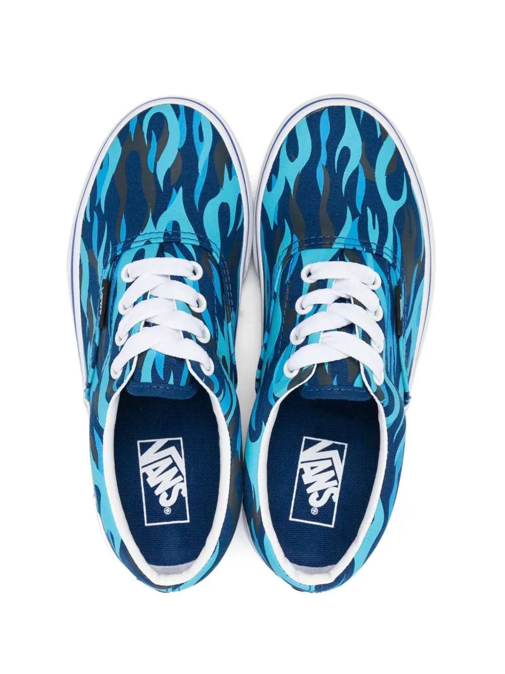 Принт с изображением пламени, маленькая подвеска с логотипом, полоски, закругленный носок, шнуровка спереди, стелька с логотипом и плоская резиновая подошва.