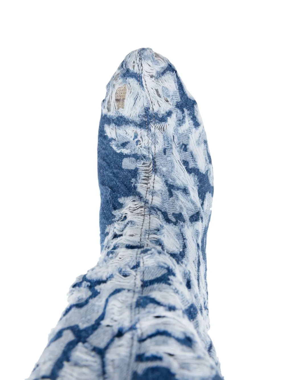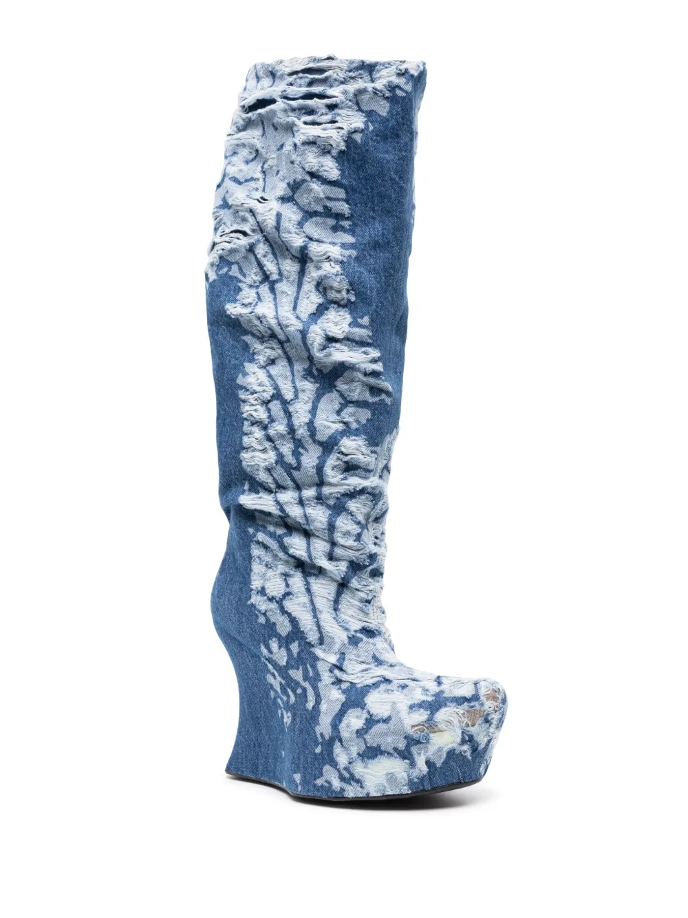 Индиго, обработанный деним, эффект потертости, модель с прорезями, заостренный носок, модель без застежки, длина ниже колена, кожаная стелька с логотипом, высокий скульптурный каблук, танкетка на платформе и резиновая подошва.