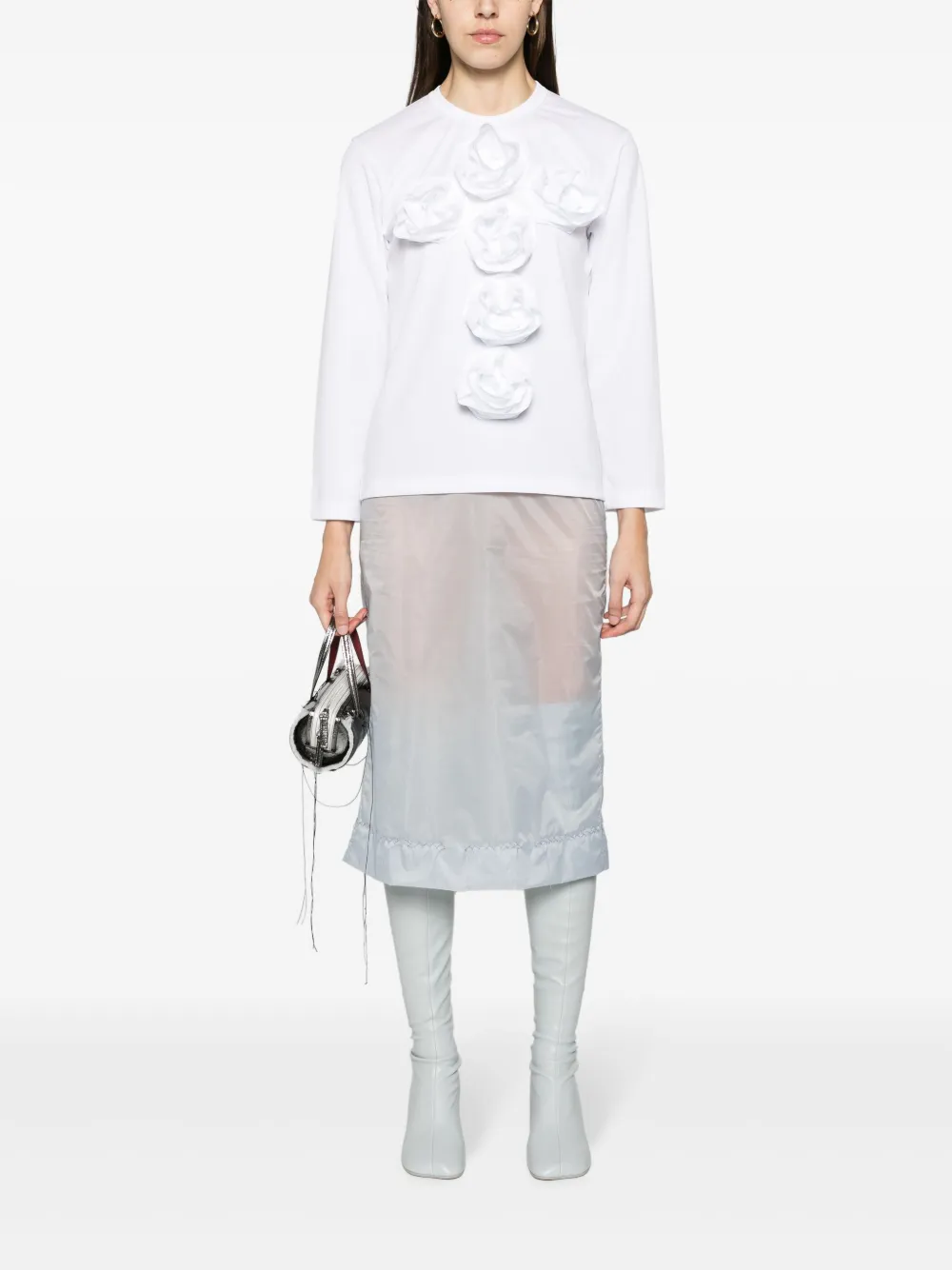 Голубой, шифон, полупрозрачный дизайн, нашивка с логотипом, декоративные швы, завышенная талия, застежка на молнии сзади, вырез сзади, прямой подол и длина ниже колена.