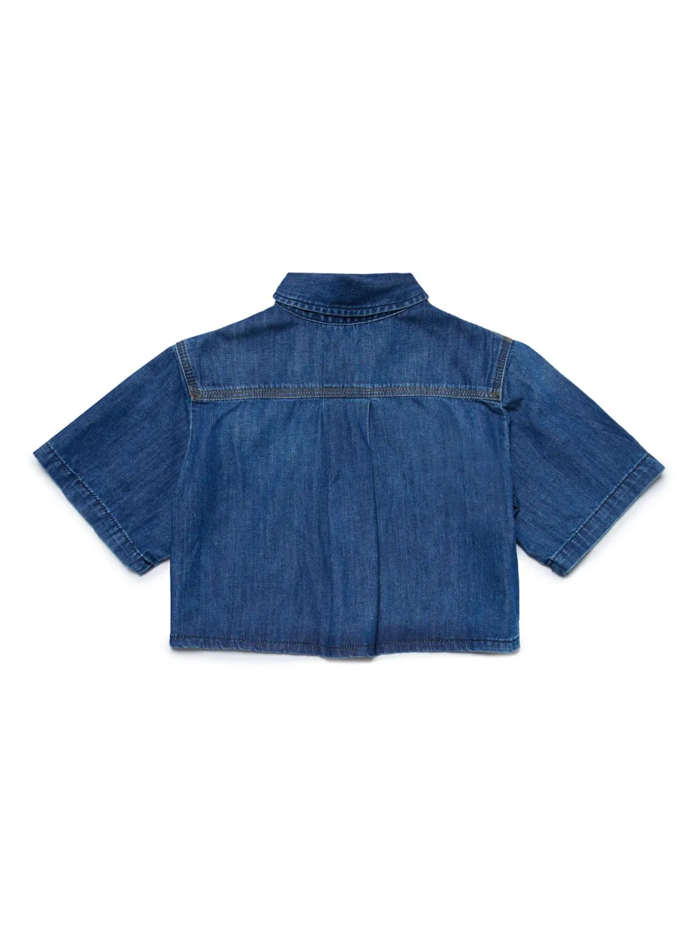 Индиго, хлопок, деним, эффект потертости, вышитый логотип, застежка на пуговицах спереди, классический воротник, короткие рукава, передний карман с клапаном и прямой подол.
