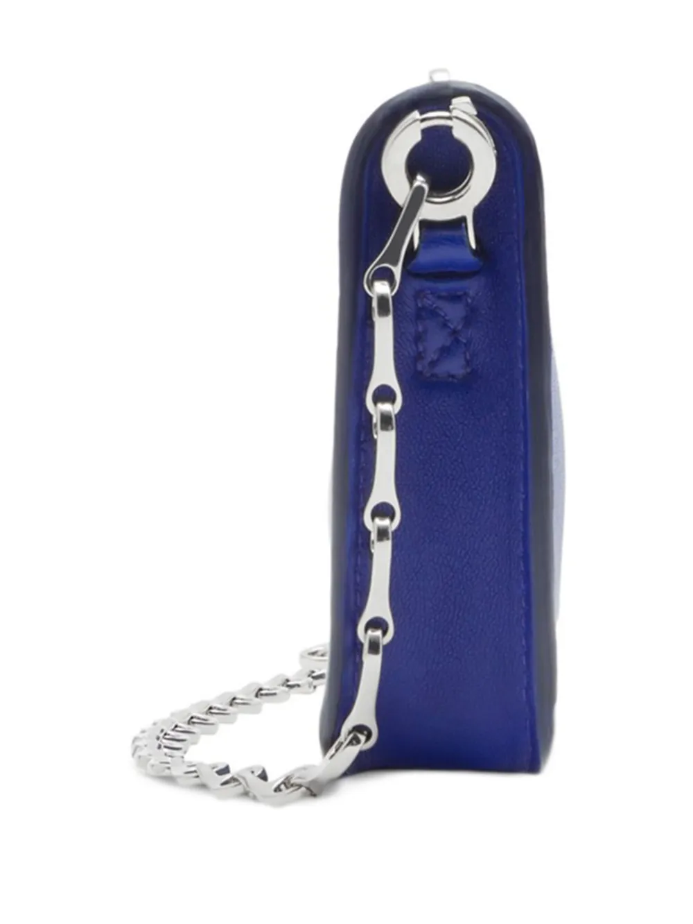 Синий, овечья кожа, гладкая текстура кожи, знаковый узор Equestrian Knight, серебристая фурнитура, застежка на молнии сверху, съемный цепочный ремень на плечо и основное отделение.