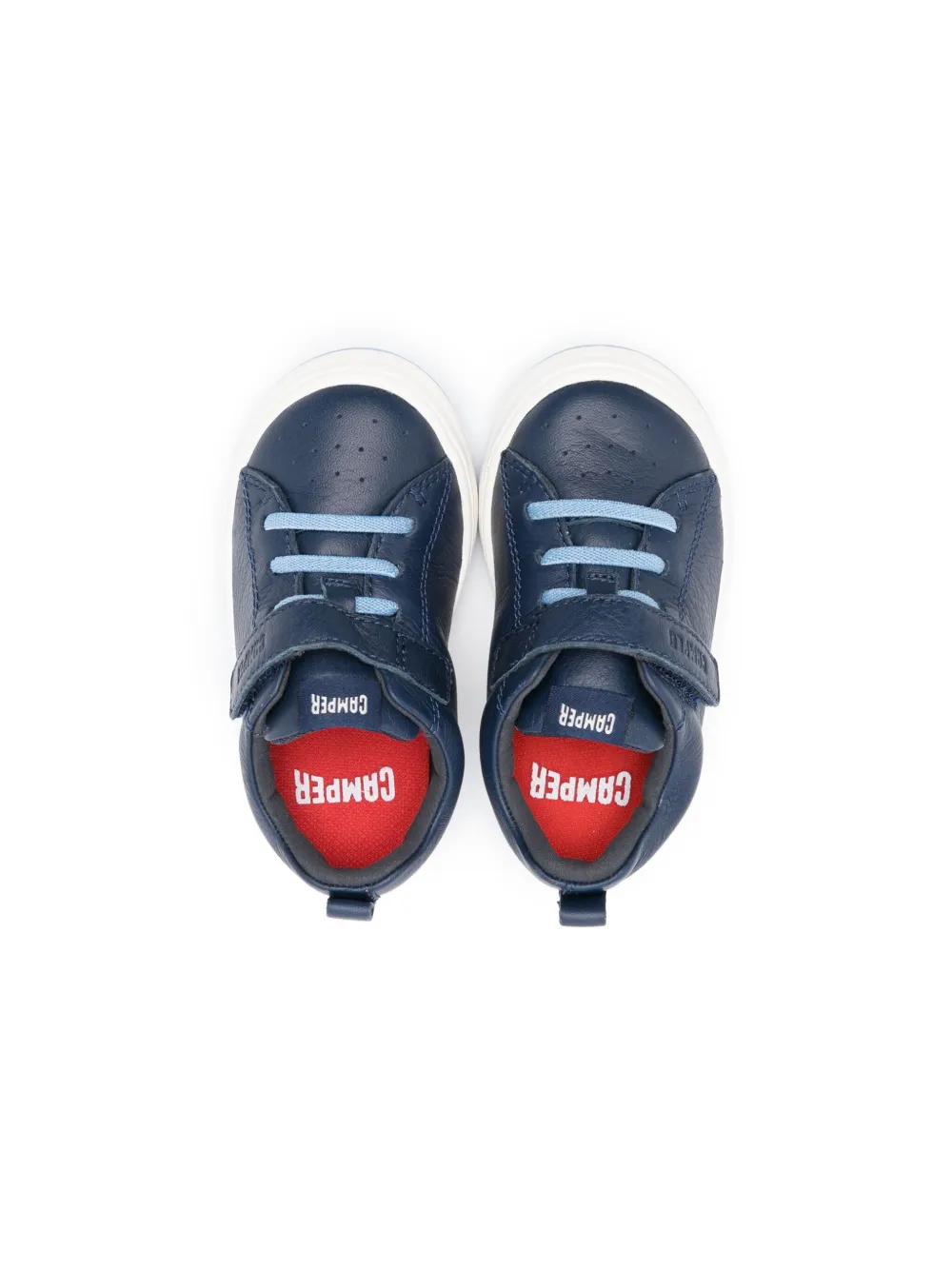 Темно-синий, васильковый, кожа, тисненый логотип спереди, перфорированный носок, шнуровка спереди, застежка на липучке спереди, петля для подтягивания сзади, закругленный носок, стелька с логотипом и плоская резиновая подошва.