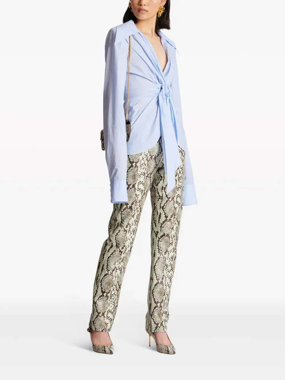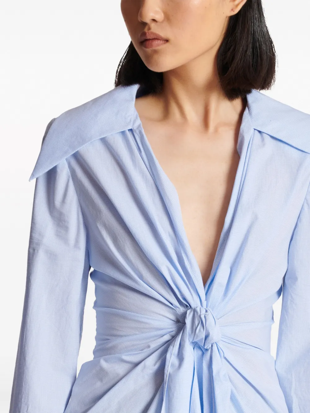 Голубой, хлопок, клетка гингем, модель на запах, плоский заостренный воротник, V-образный вырез, длинные рукава, рукава с манжетами на пуговицах и закругленный подол.