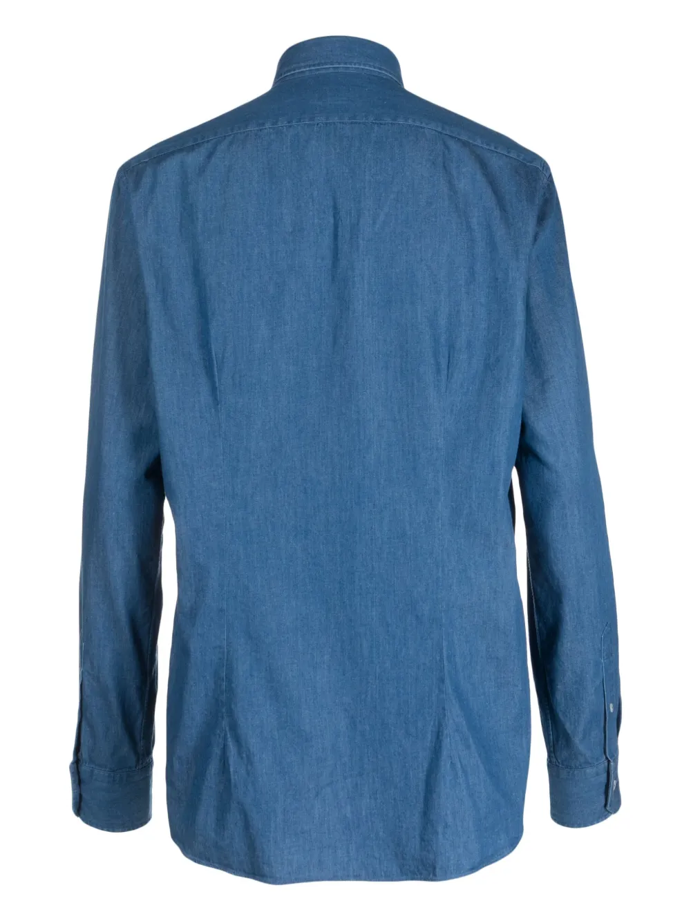 Пудрово-голубой, хлопок, отложной воротник, застежка на пуговицах спереди, длинные рукава, рукава с манжетами на пуговицах и закругленный подол.