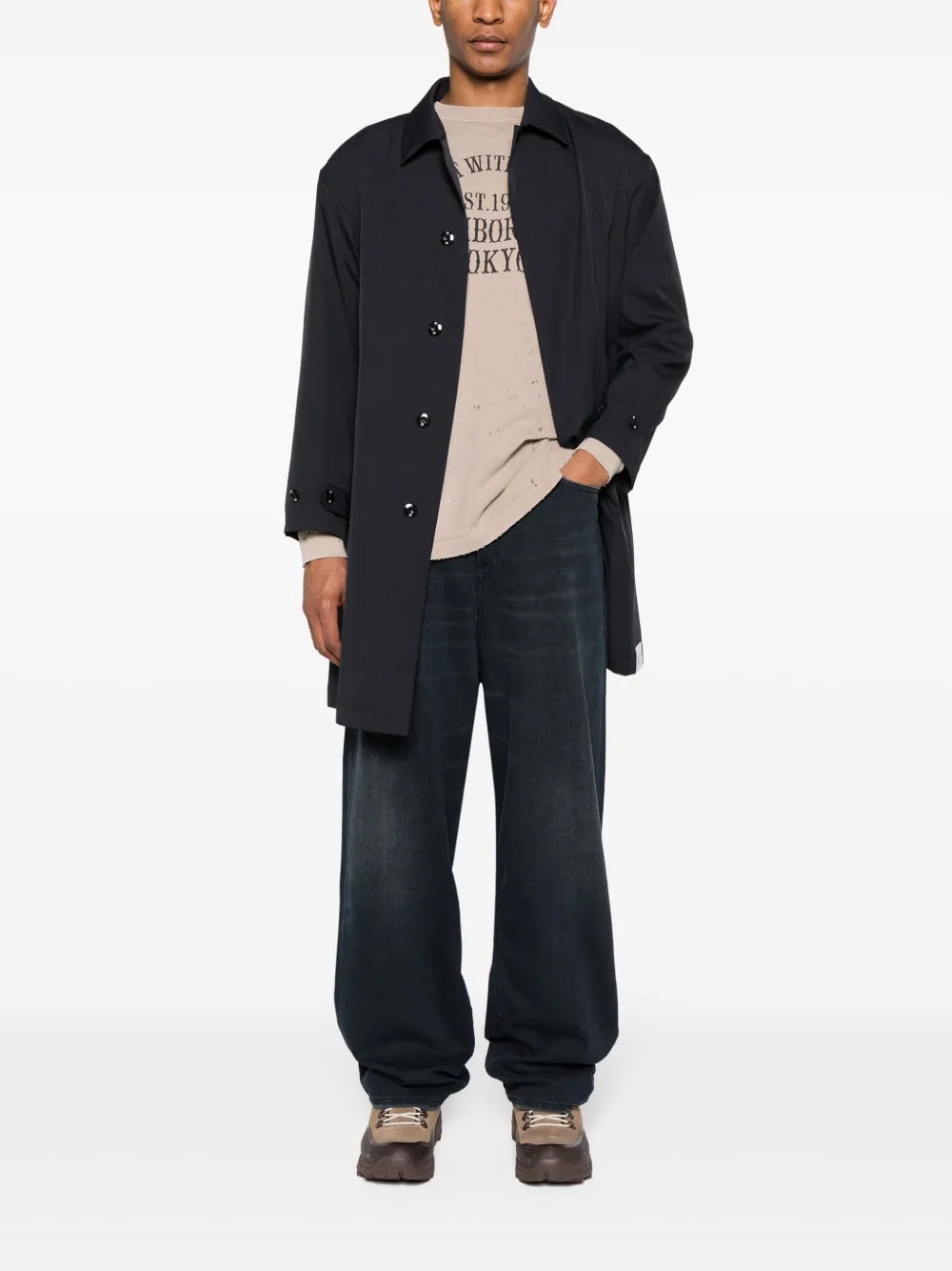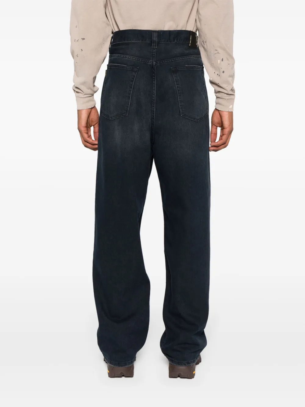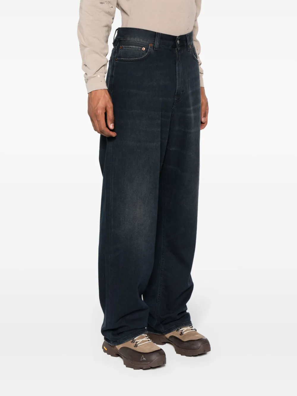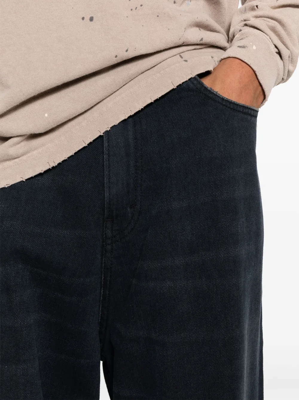 Подробнее о товаре: • темно-синий • смесовый хлопок • ткань с твиловым переплетением • обработанный деним • декоративные складки на бедрах • эффект потертости • тональная строчка • маленькая подвеска с логотипом • нашивка с логотипом сзади • средняя посадка • потайная застежка на молнии и пуговицах • петли для ремня • классическая пятикарманная модель • свободный крой • прямой подол