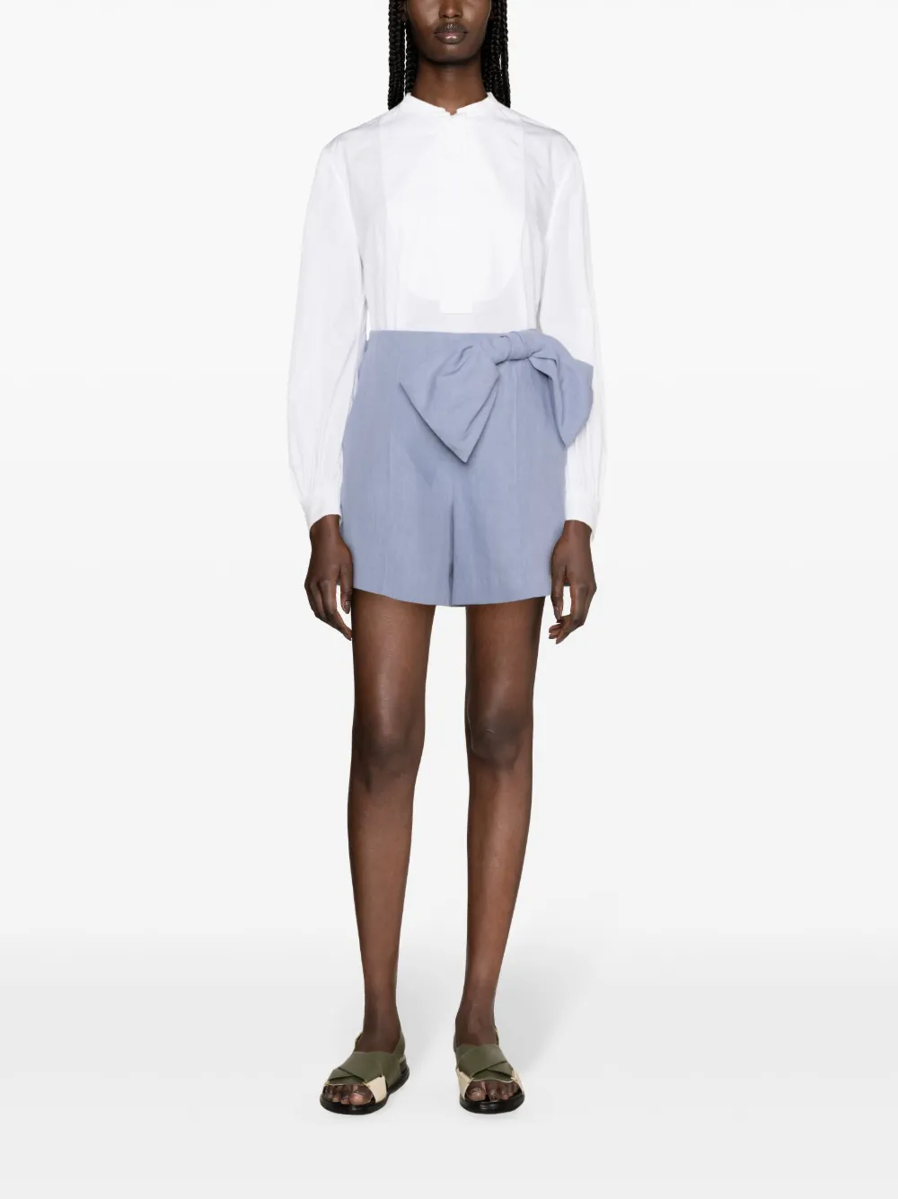 Подробнее о товаре: • голубой • лен • бант • завышенная талия • потайная застежка на молнии сбоку • два кармана по бокам • стрелки • длина до бедер • Этот товар как минимум на 50% состоит из материалов, которые признаны более безопасными для окружающей среды, и/или произведены с использованием методов, которые помогают сократить потребление воды и химических веществ. • Узнать больше о том, какие товары получают отметку «Ответственный выбор», можно здесь.