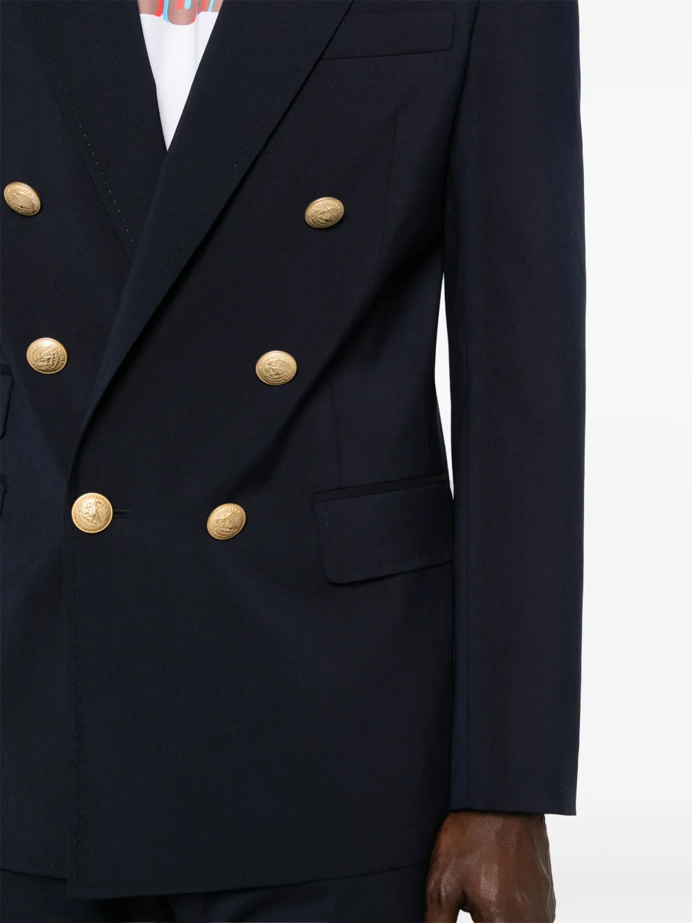Подробнее о товаре: • темно-синий • вирджинская шерсть • заостренные лацканы • длинные рукава с манжетами на пуговицах • пуговицы с тисненым логотипом • прорезной карман на груди • два передних кармана с клапанами • две боковые шлицы сзади • внутренние прорезные карманы • цельная подкладка • двубортная застежка на пуговицы