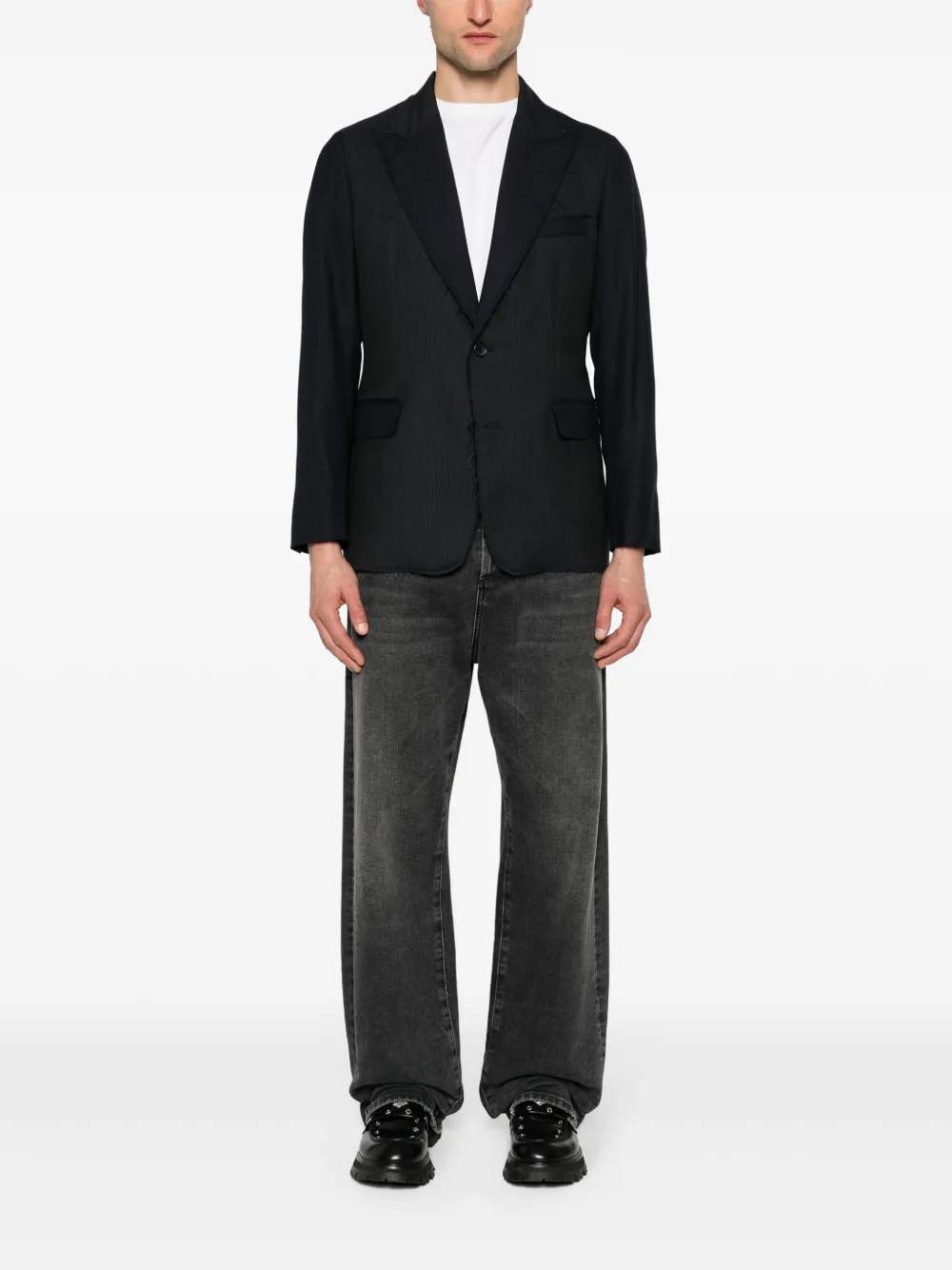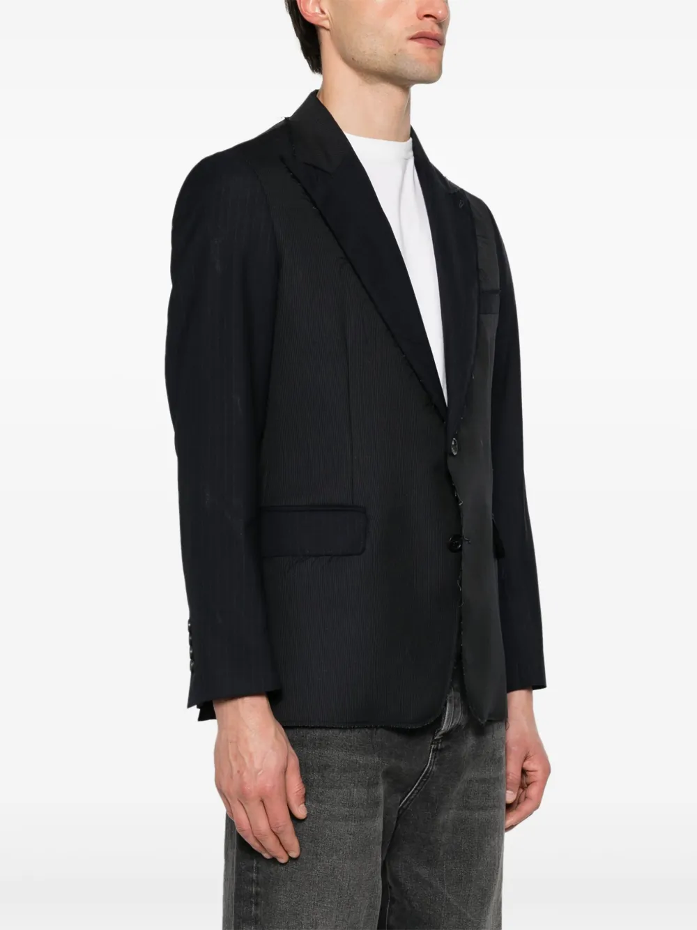 Подробнее о товаре: • темно-синий • вирджинская шерсть • узор в тонкую полоску • заостренные лацканы • необработанные детали • длинные рукава • манжеты на пуговицах • прорезной карман на груди • два кармана с клапанами по бокам • две боковые шлицы сзади • внутренняя бирка с логотипом • внутренний прорезной карман • цельная подкладка • закругленный подол • застежка на пуговицах спереди