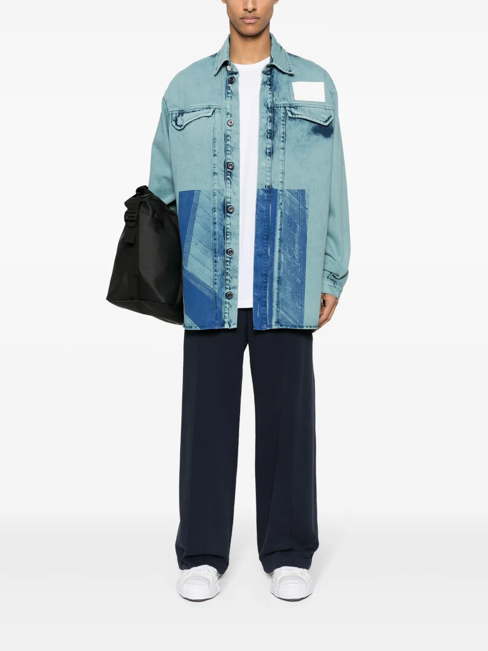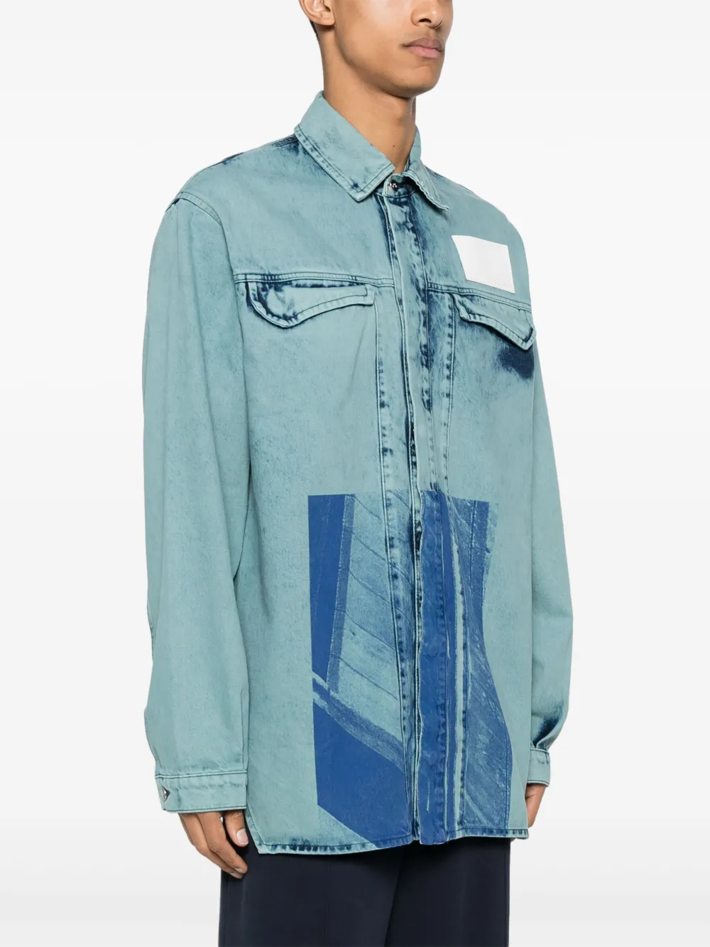 Подробнее о товаре: • синий • хлопок • обработанный деним • принт с абстрактным узором спереди • нашивка с логотипом на груди • логотип сзади • пуговицы с выгравированным логотипом • складки на рукавах • классический воротник • заниженная линия плеч • длинные рукава • манжеты на пуговицах • два нагрудных кармана с клапанами • разрезы по бокам • прямой подол • потайная застежка на кнопках спереди