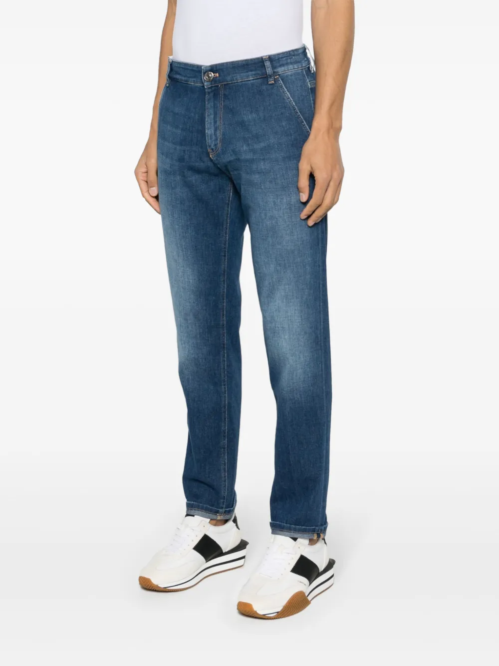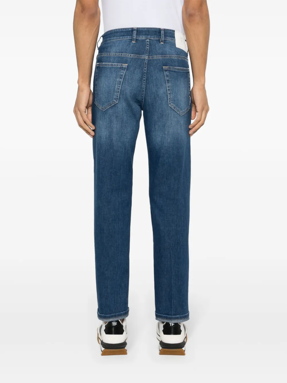 Подробнее о товаре: • индиго • смесовый хлопок • эластичный материал • обработанный деним • эффект потертости • контрастная строчка • петли для ремня • классическая пятикарманная модель • заклепки • декоративные складки на бедрах • длина по щиколотку • подвороты • нашивка с логотипом сзади • логотип сзади • узкий крой • пуговица с тисненым логотипом • потайная застежка на молнии и пуговицах