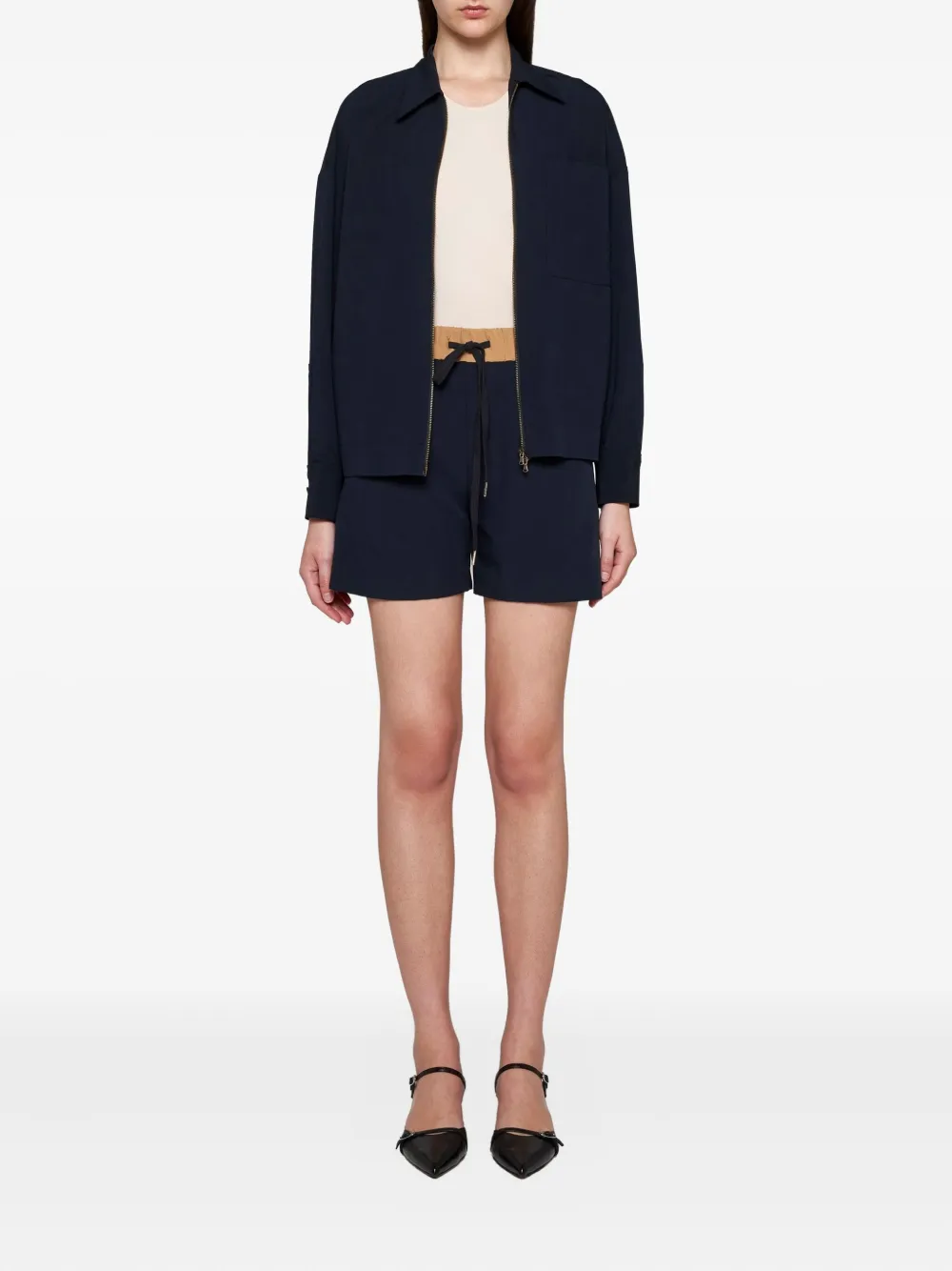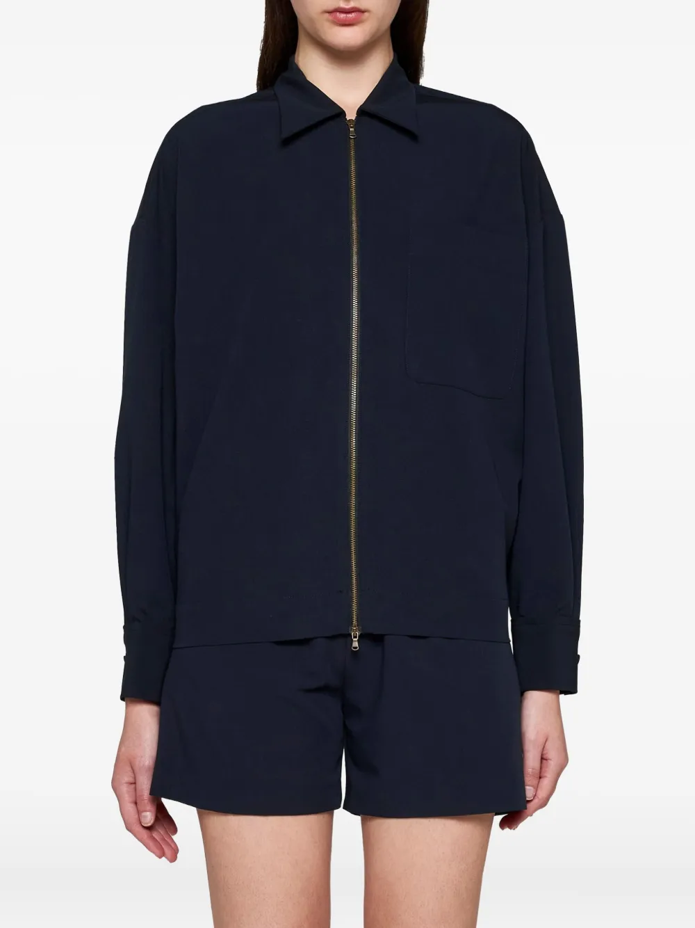 Темно-синяя застежка-молния спереди, классический воротник, нагрудный накладной карман, длинные рукава