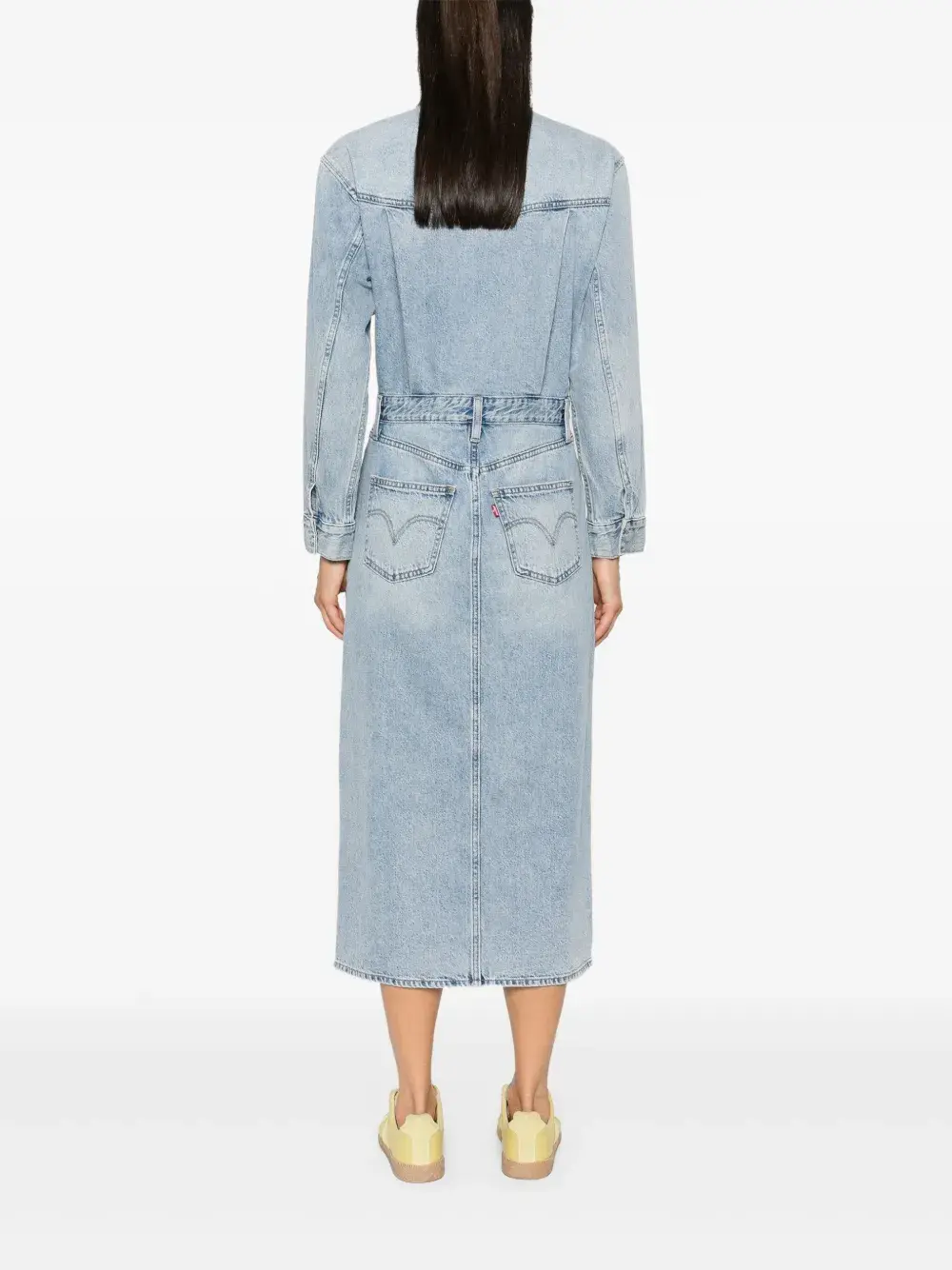 Подробнее о товаре: • голубой • хлопок • обработанный деним • эффект потертости • контрастная строчка • классический воротник • длинные рукава • манжеты с застежкой на кнопки • два накладных кармана на груди • петли для ремня • классическая пятикарманная модель • заклепки • декоративные складки • разрез спереди • длина до середины икры • бирка с логотипом сзади • прямой подол • потайная застежка на молнии и пуговицах • потайная застежка на кнопках спереди