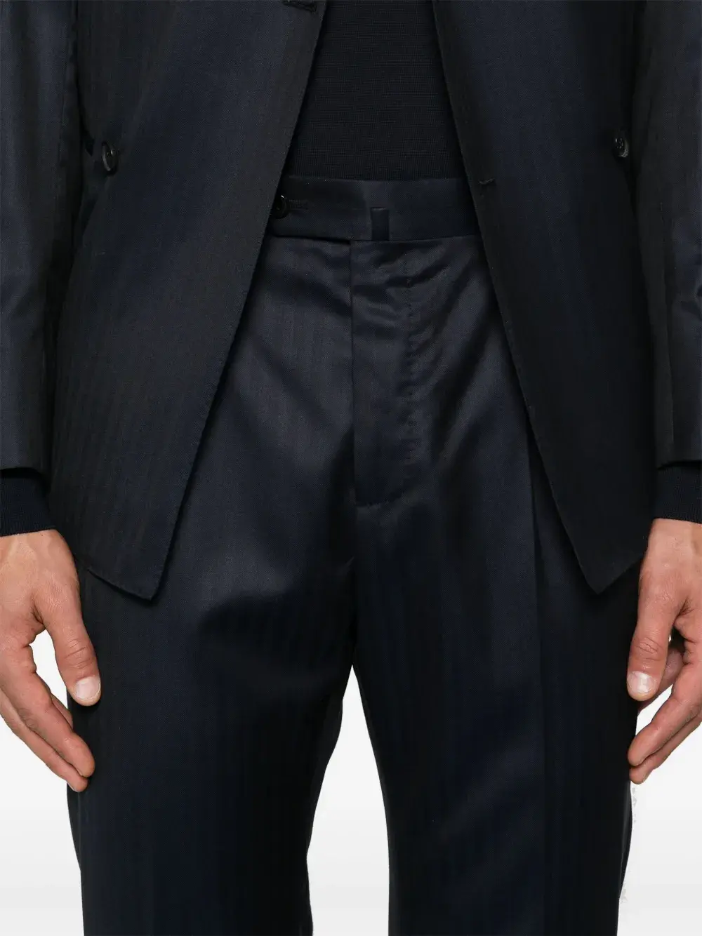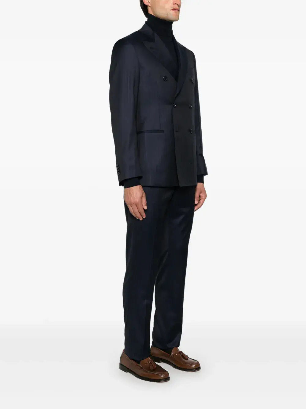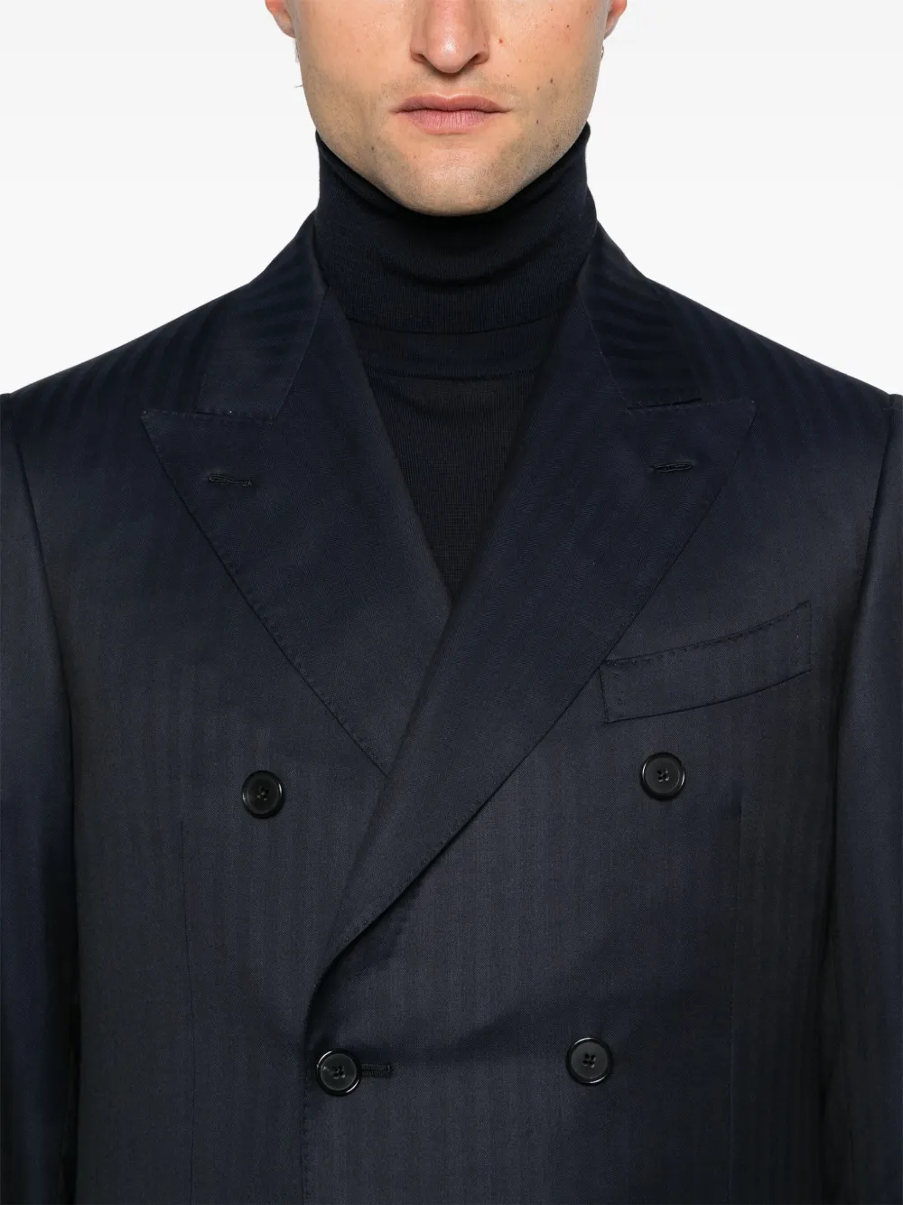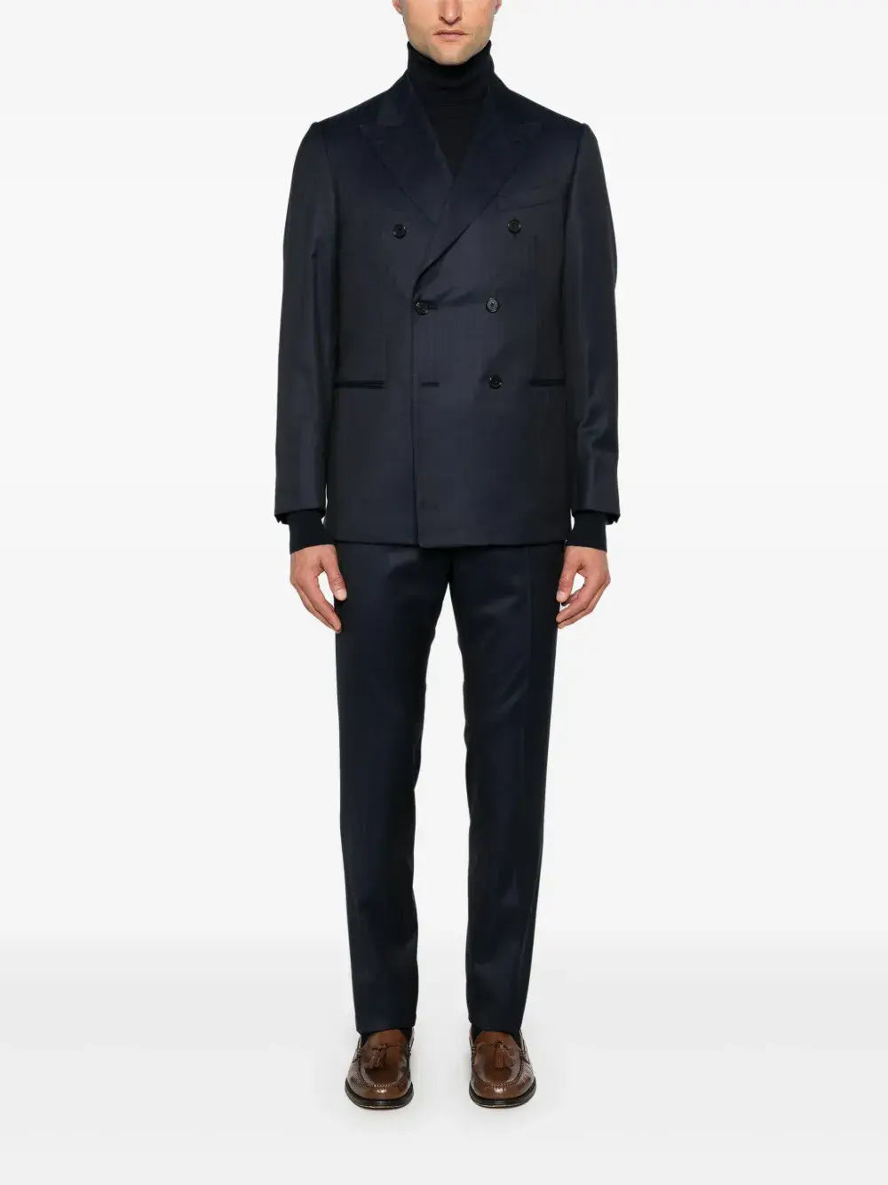 Подробнее о товаре: • темно-синий • смесовая шерсть • узор в вертикальную полоску • двубортная застежка на пуговицы • заостренные лацканы • подплечники • длинные рукава • манжеты на пуговицах • прорезной карман на груди • два прорезных кармана спереди • две боковые шлицы сзади • внутренние прорезные карманы • потайная застежка на молнии и пуговицах • петли для ремня • складки • два диагональных кармана по бокам • два прорезных кармана на пуговицах сзади