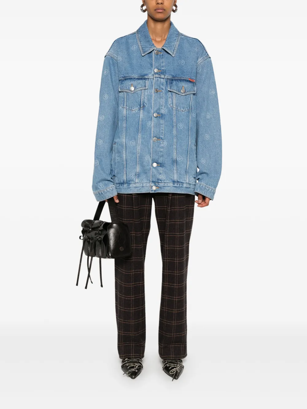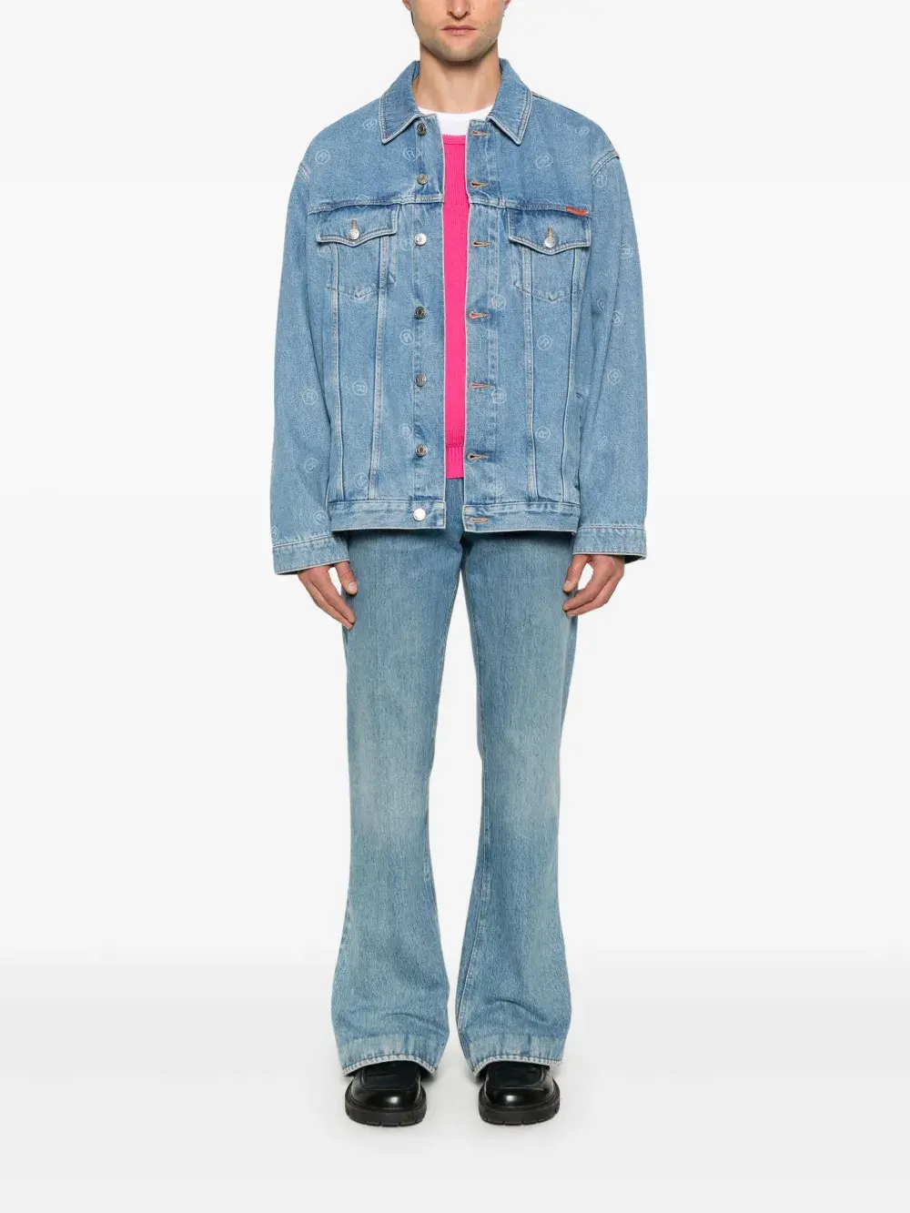 Подробнее о товаре: • пастельно-синий • хлопок • обработанный деним • застежка на пуговицах спереди • классический воротник • сплошной принт с логотипом • приспущенные плечи • длинные рукава • манжеты на пуговицах • нашивка с логотипом на груди • два нагрудных кармана на пуговицах • два прорезных кармана сбоку • ремешки на пуговицах • прямой подол • Это унисекс-модель. Обратите внимание, что для нее используется мужская размерная сетка.