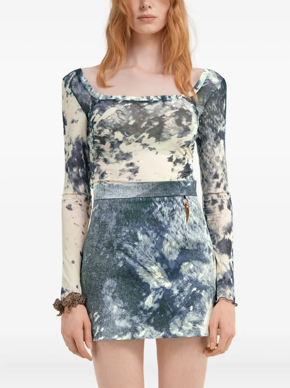 Индигово-синего цвета с фестончатым краем, квадратным вырезом, квадратной открытой спиной, длинными рукавами