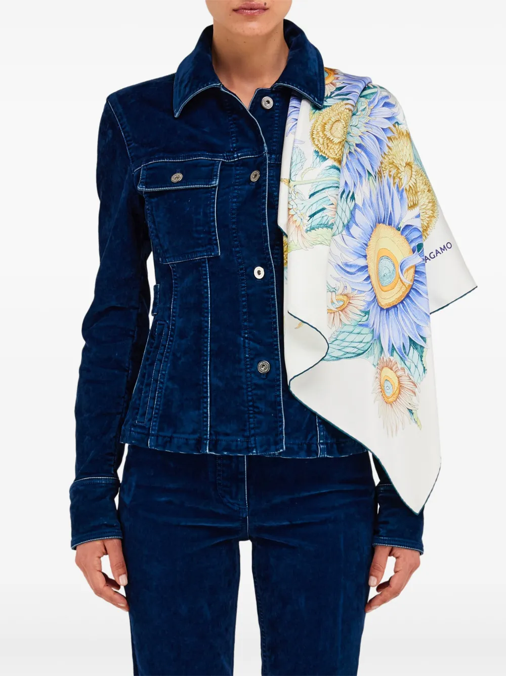Этот шарф из чистого шелкового твила, вдохновленный историческим мотивом и переосмысленный в современных оттенках и деталях, украшен роскошным букетом подсолнухов. Подсолнух, символ радости, позитива, силы и верности, - один из любимых мотивов Сальваторе Феррагамо в его композициях.