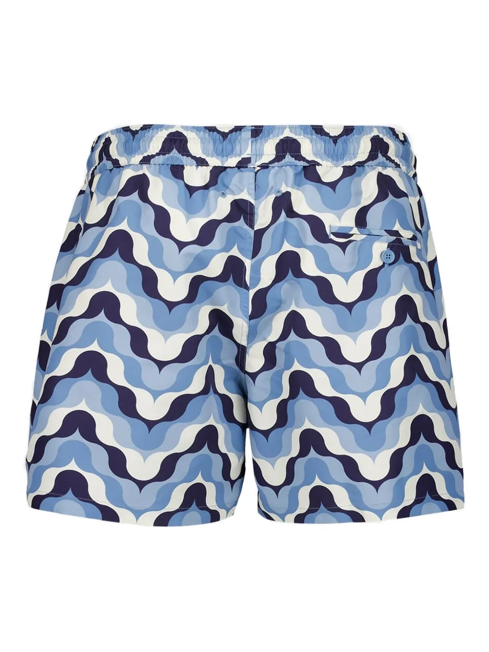 Темно-синий волнистый узор, эластичный пояс, застежка на шнурок, карман на пуговицах. Обязательно примеряйте купальники поверх своей одежды.