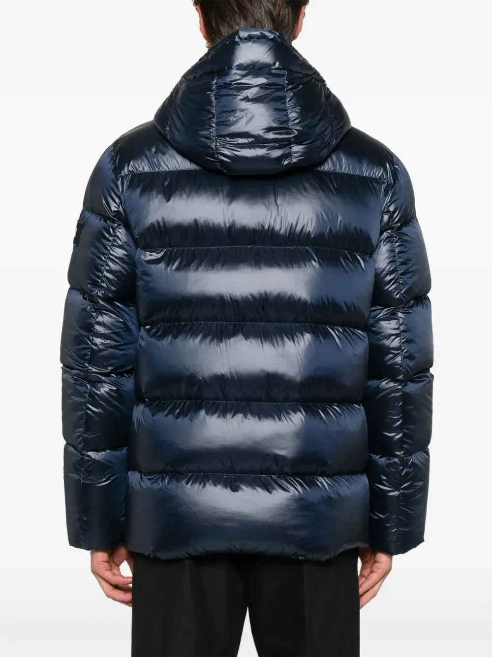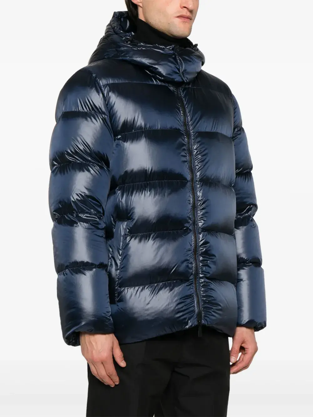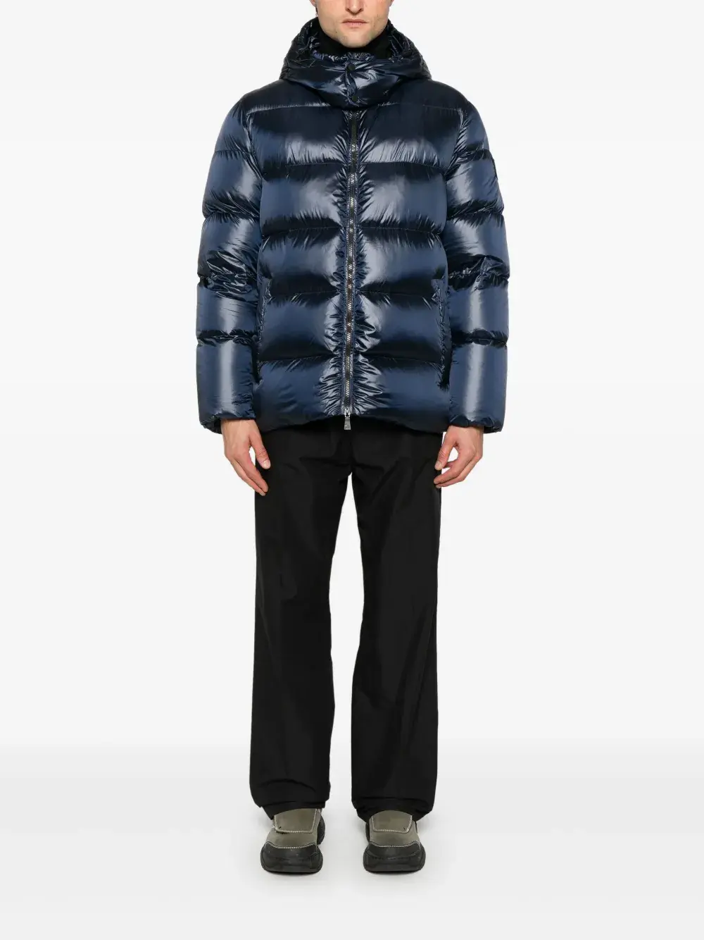 Подробнее о товаре: • синий • глянцевая фактура • водоотталкивающий материал • дутый материал • наполнитель из гусиного пуха • затягивающийся на шнурок капюшон • двусторонняя молния спереди • воротник-стойка • длинные рукава • нашивка с логотипом на рукаве • эластичные манжеты • два кармана на молнии по бокам • внутренние прорезные карманы • внутренние лямки • прямой подол