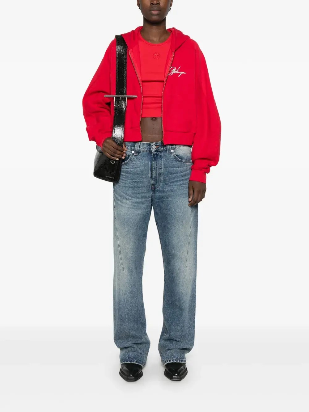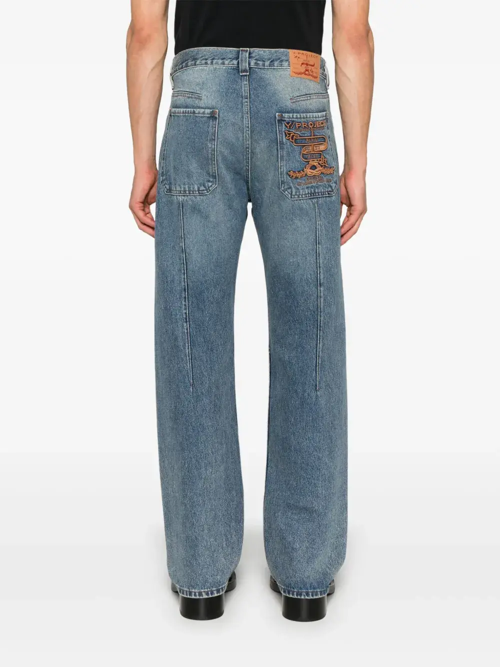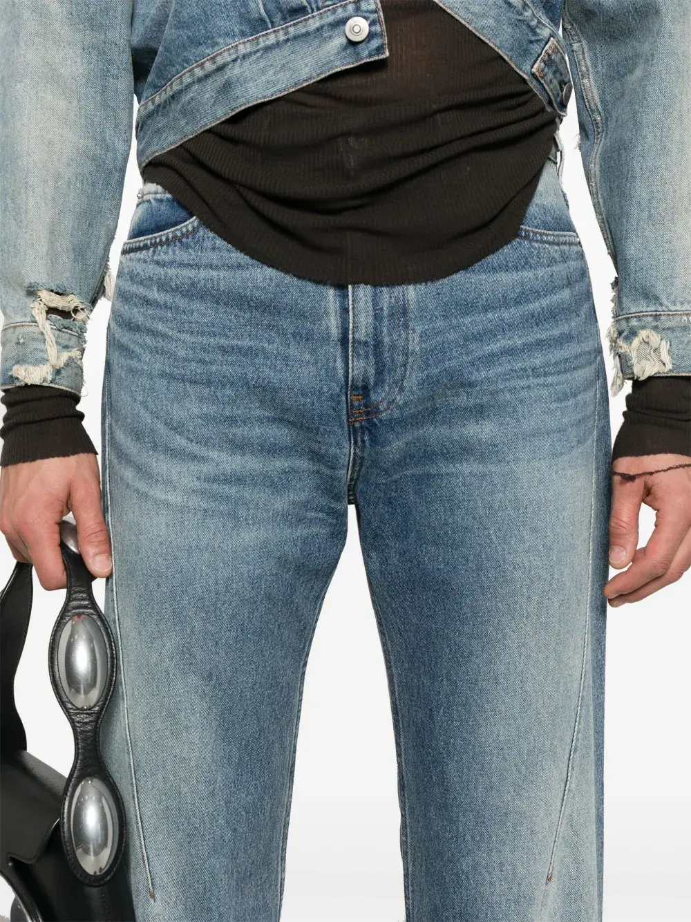 Подробнее о товаре: • синий • органический хлопок • обработанный деним • декоративные складки на бедрах • защипы • потайная застежка на молнии и пуговицах • контрастная строчка • петли для ремня • классическая пятикарманная модель • заклепки • нашивка с логотипом сзади • вышитый логотип сзади • прямой крой • Это унисекс-модель. Обратите внимание, что для нее используется мужская размерная сетка.