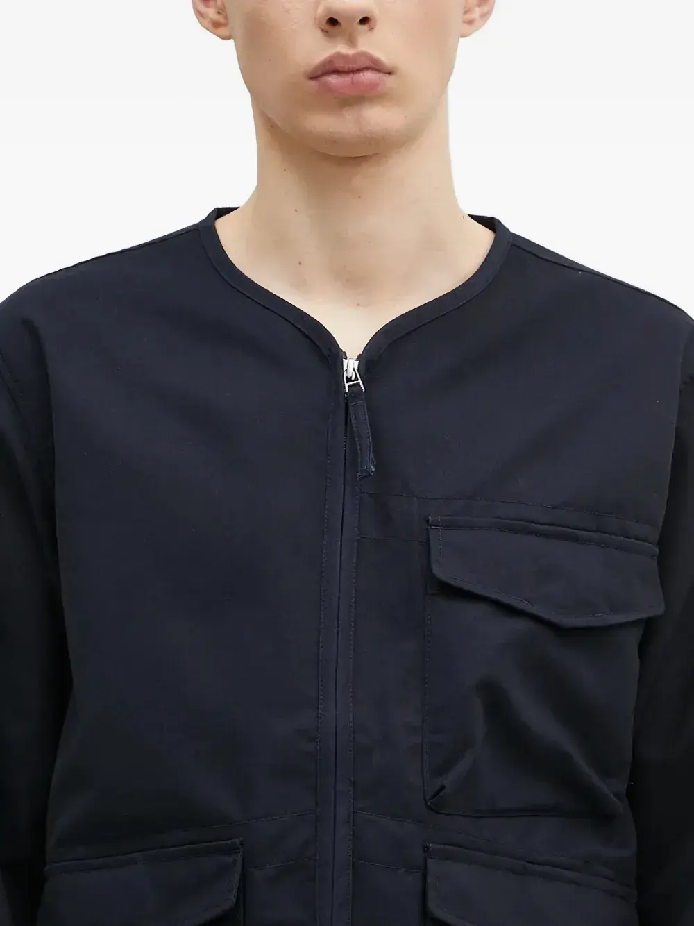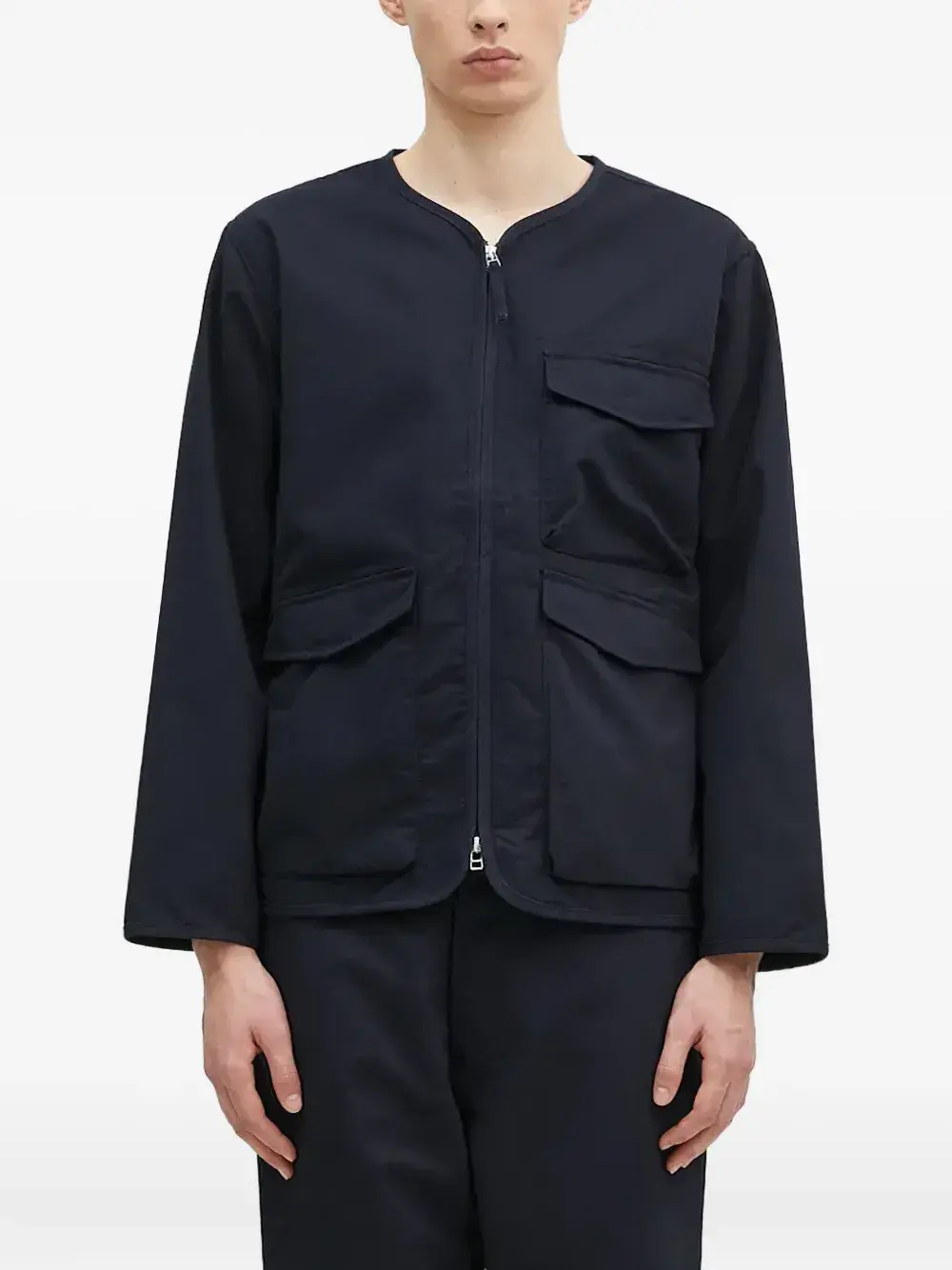 Темно-синяя застежка-молния спереди, множество карманов, длинные рукава