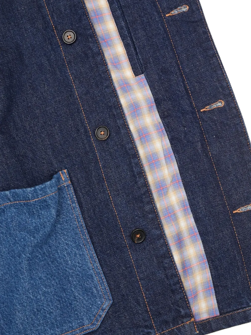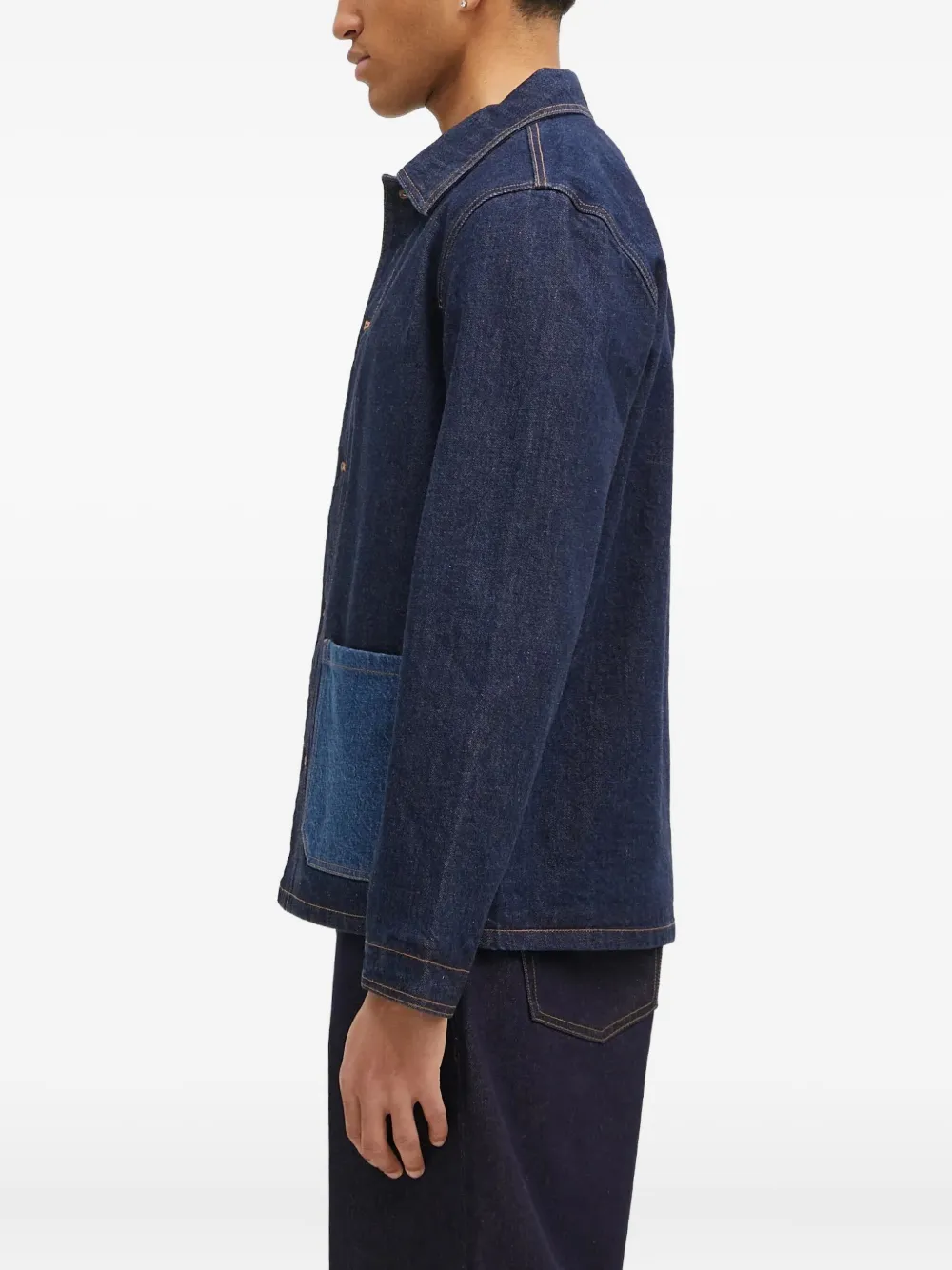 Контрастные накладные карманы цвета индиго, застежка на пуговицы спереди, контрастная строчка