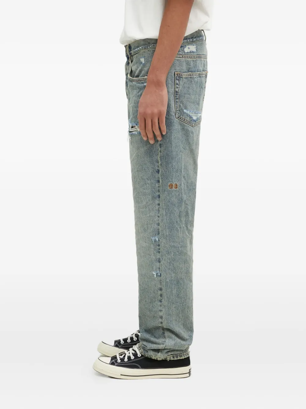 Светло-голубой, с потертыми деталями, вышитым знаком плюс, нашивкой на заднем кармане, выбеленной камнем