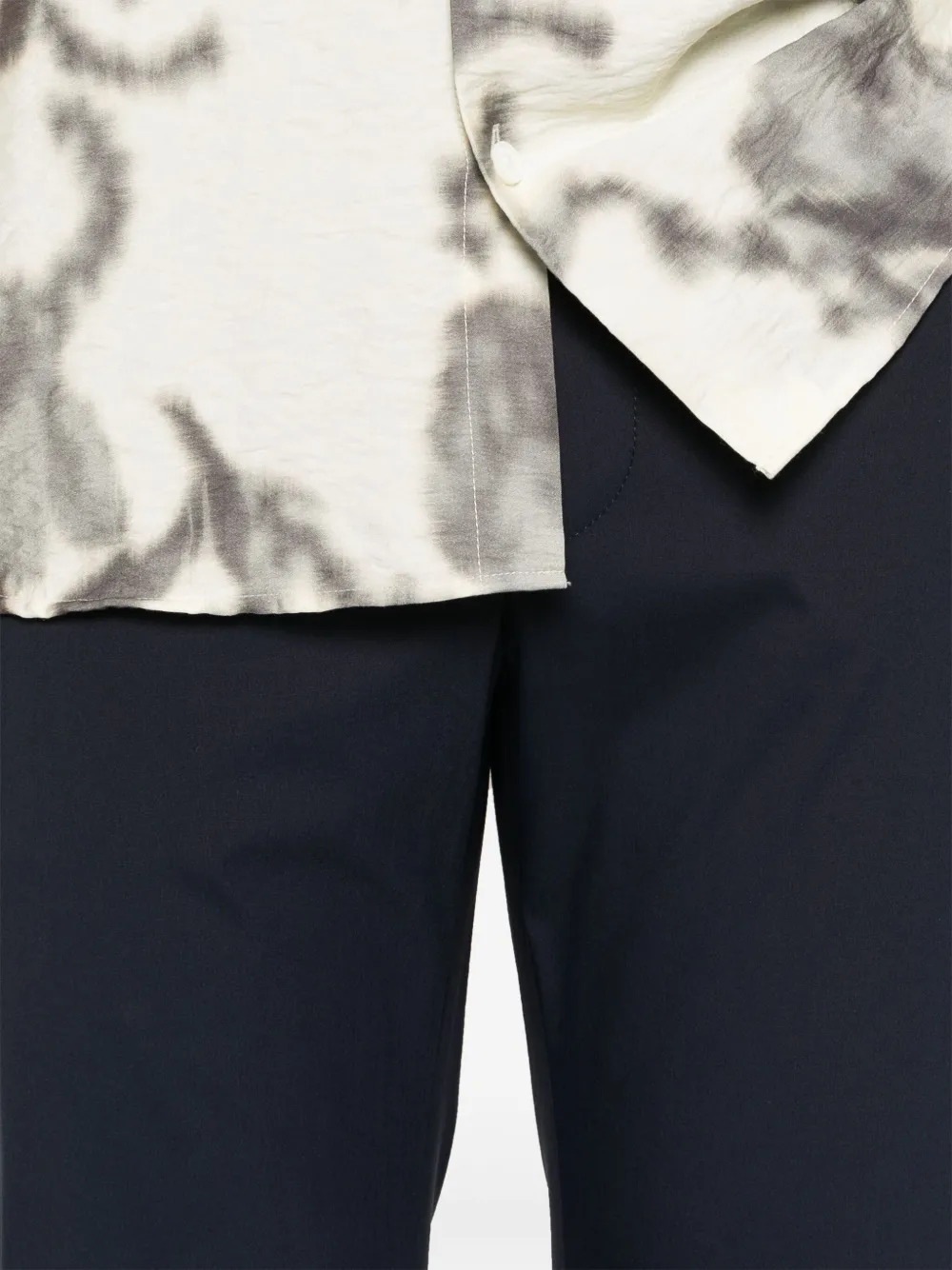Синяя застежка на пуговицу и молнию спереди, накладные карманы по бокам, шлевки для ремня, два накладных кармана сзади