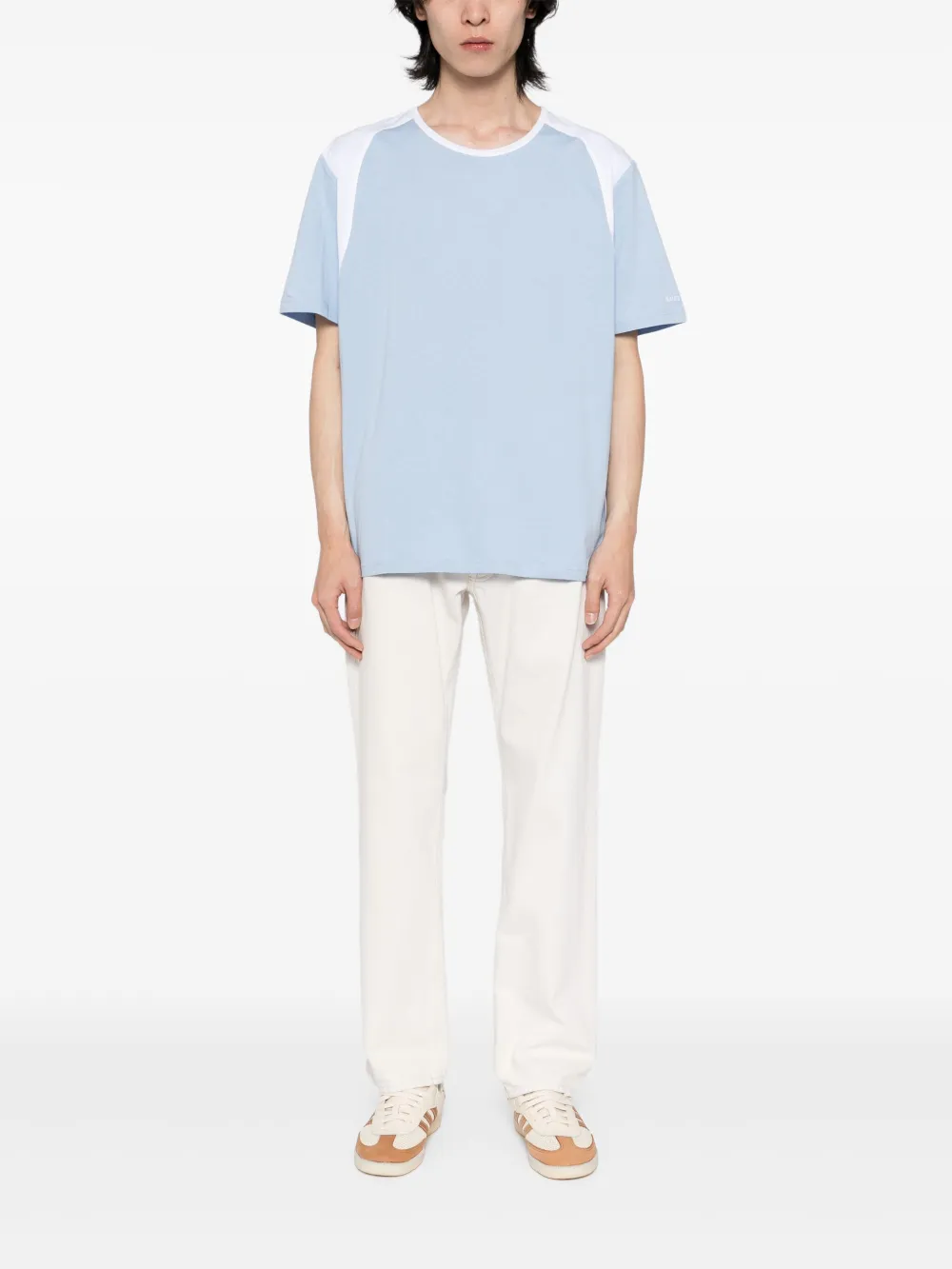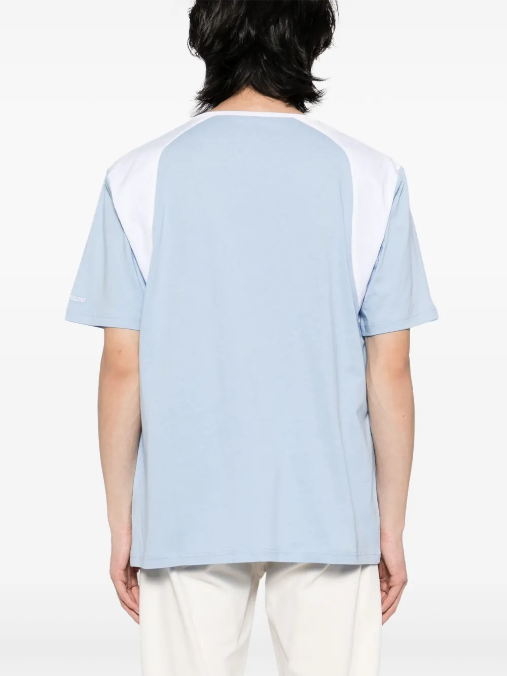 Светло-голубой круглый вырез горловины, короткие рукава, вышитый логотип на рукаве