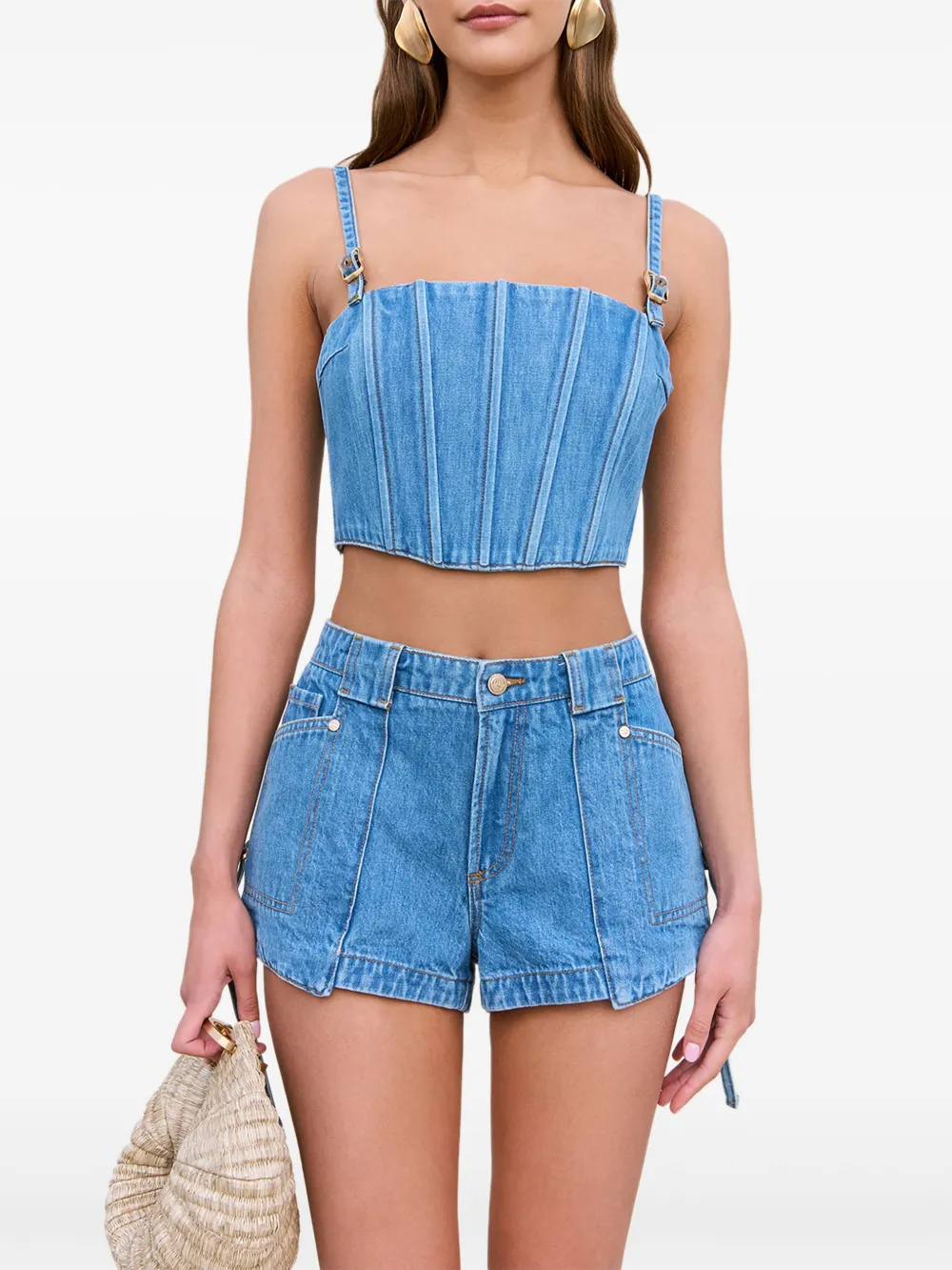 Синяя джинсовая ткань, застежка-молния, регулируемые бретели, лиф на косточках