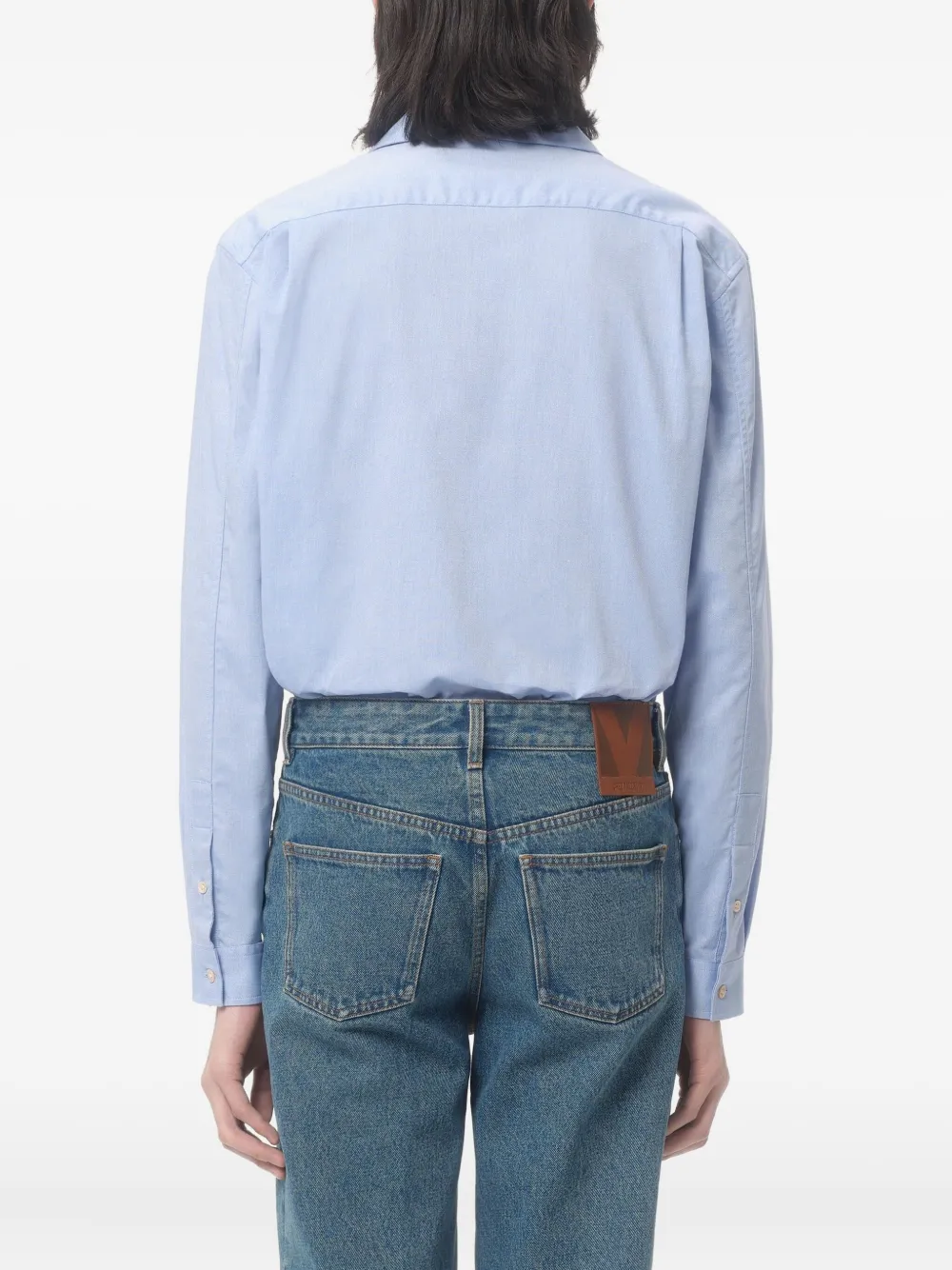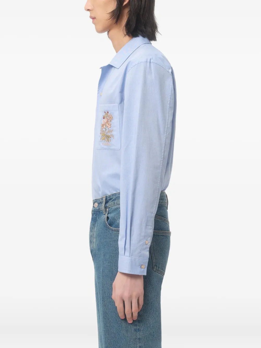 Светло-голубой спереди, застежка на пуговицы, воротник-стойка, манжеты на рукавах с пуговицами, нагрудный накладной карман