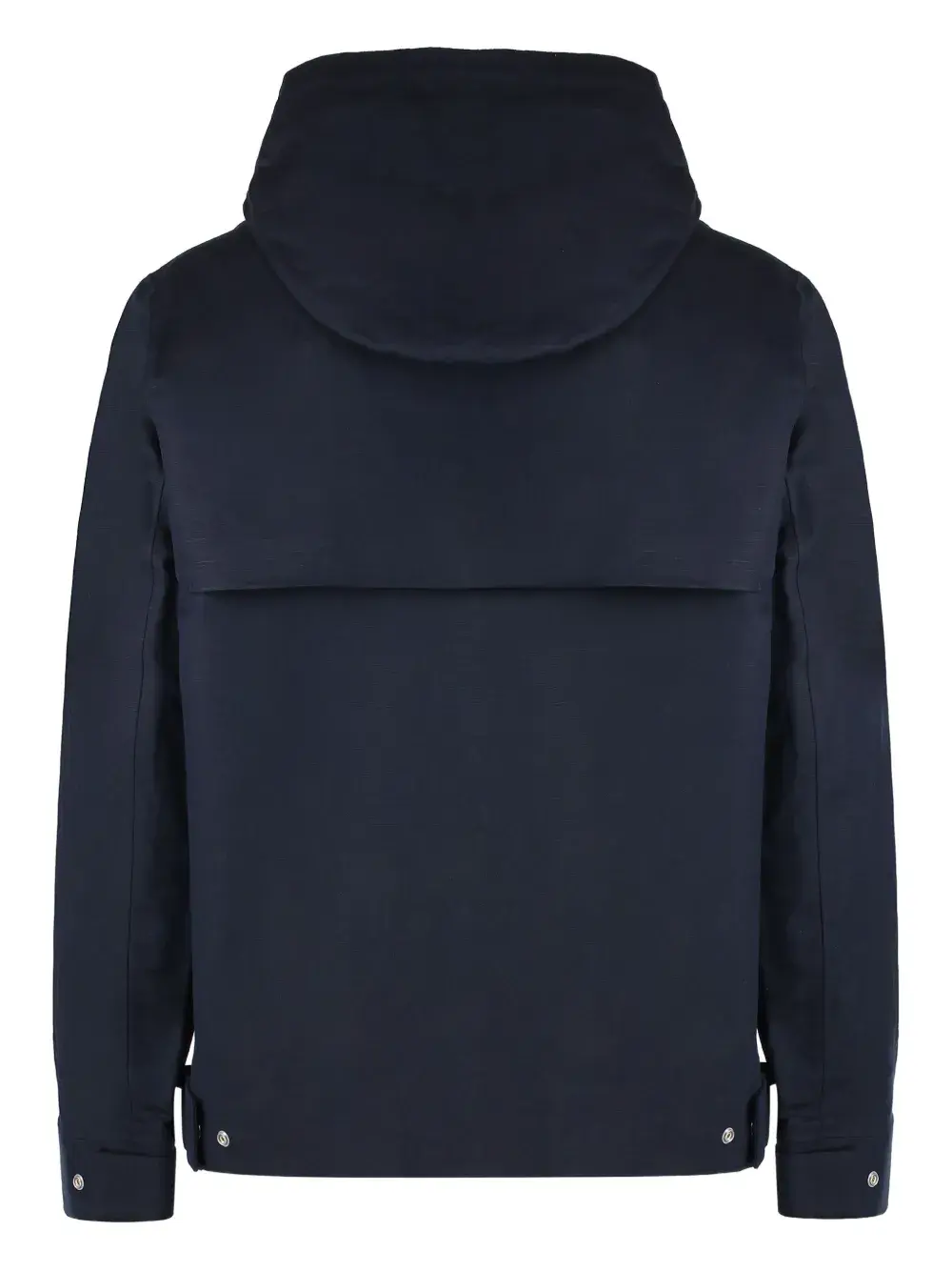 Темно-синие передние карманы с клапанами, застежка на кнопку, манжеты, ветрозащитная планка, потайная застежка-молния