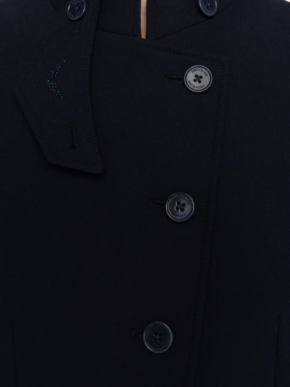 Темно-синий воротник-стойка, застежка на пуговицы, широкие рукава, прямой подол
