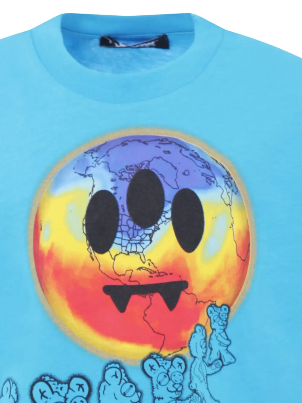Графика с изображением небесно-голубого медведя, крупный мотив глобуса, смайлики, деталь логотипа на подоле