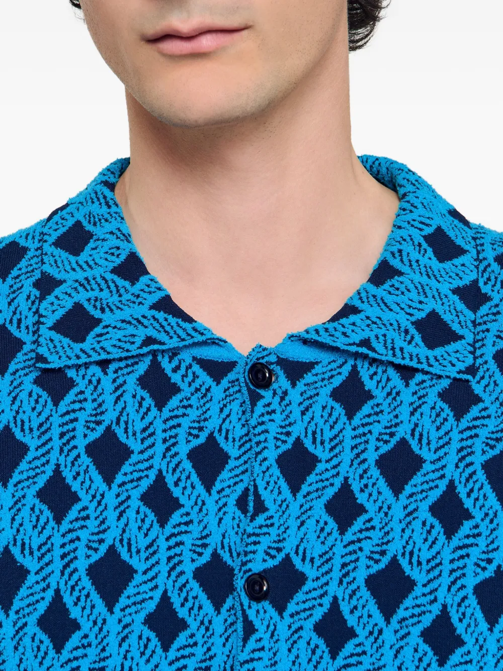 Бирюзовый, короткие рукава, застежка на пуговицы, отложной воротник, геометрический узор