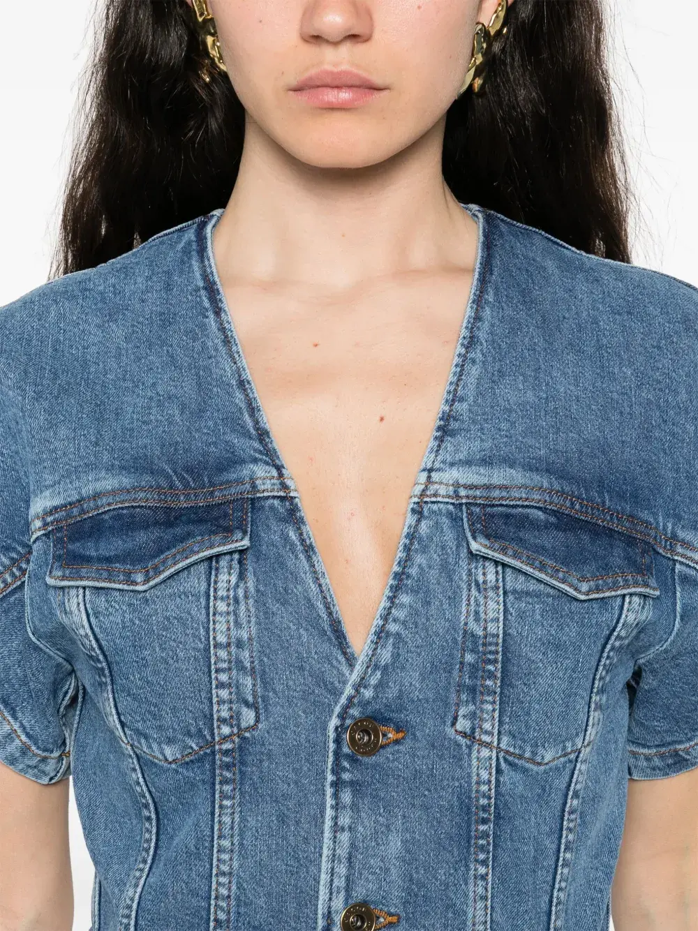 Синяя застежка на пуговицы спереди, V-образный вырез, короткие рукава