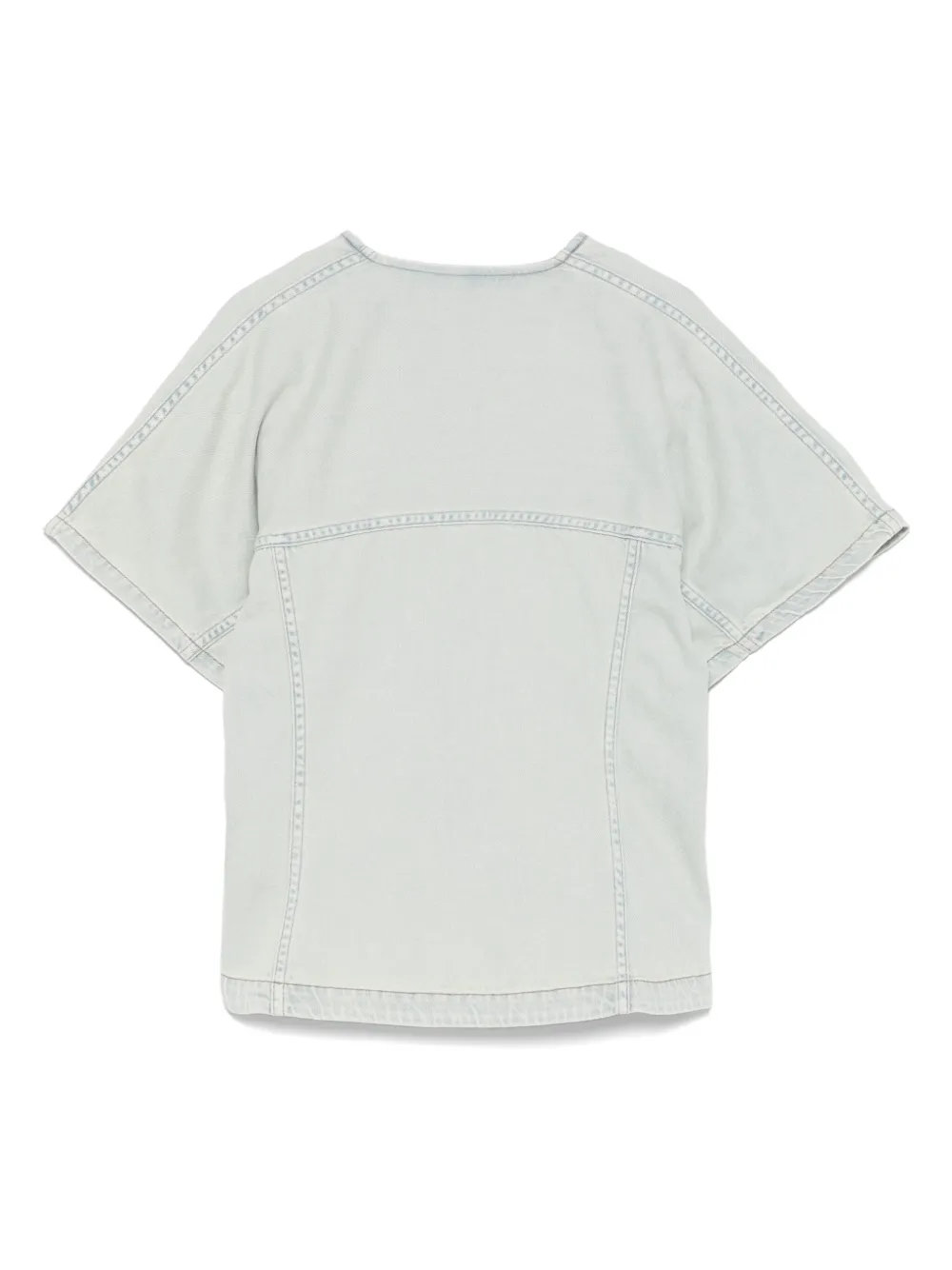 Светло-голубая застежка на пуговицы спереди, два нагрудных кармана с клапанами, многослойные детали, V-образный вырез