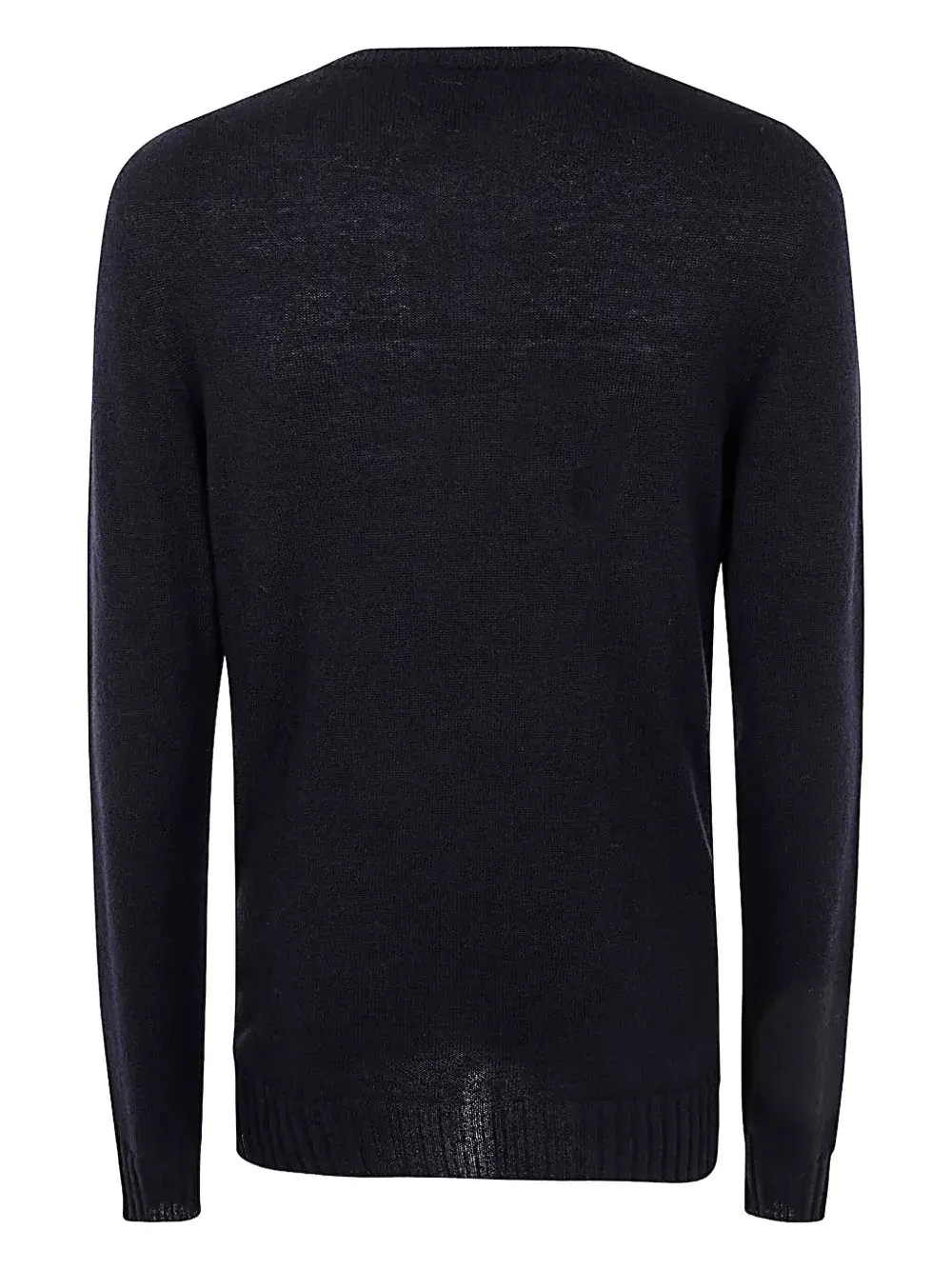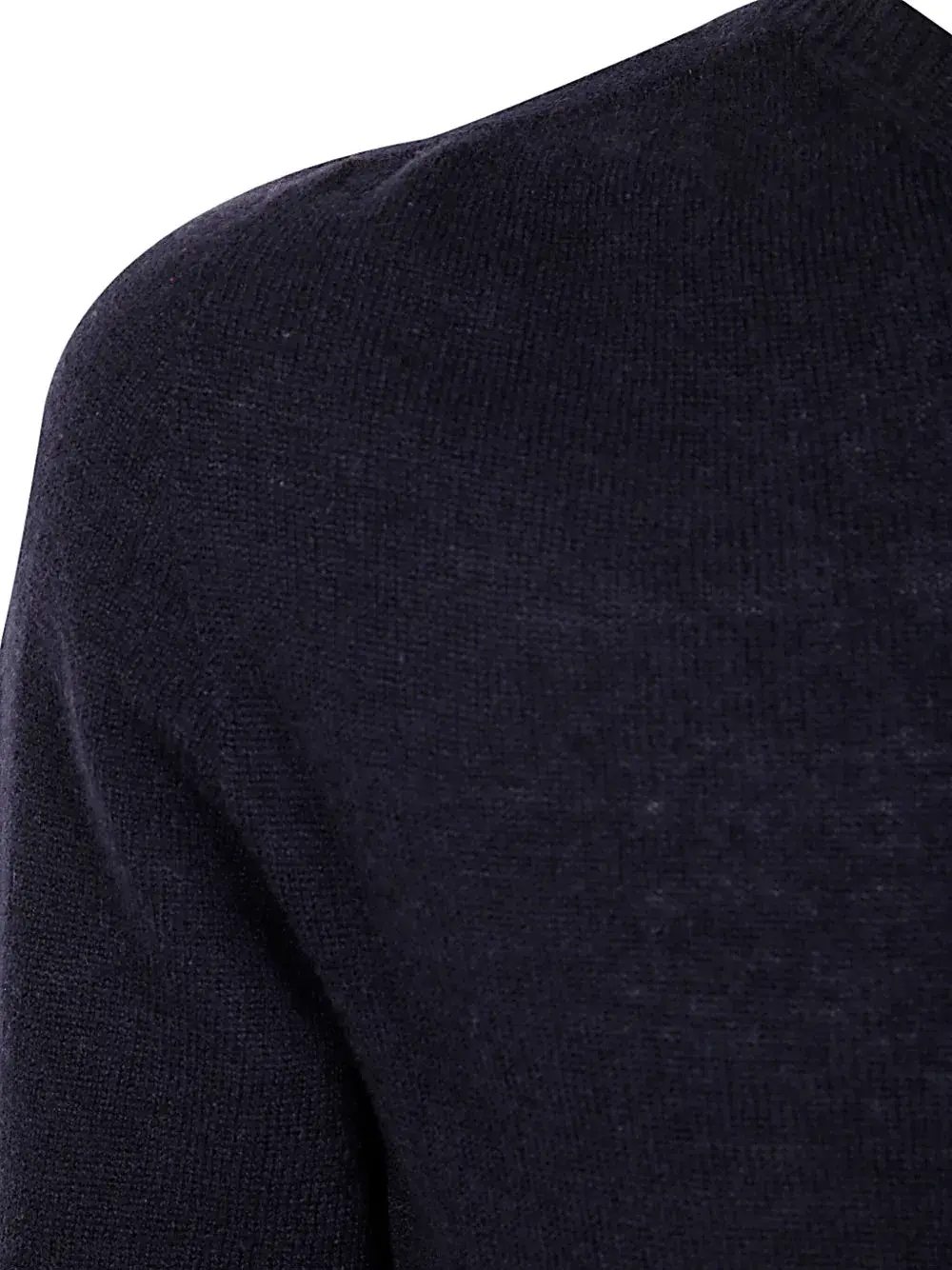 Темно-синий круглый вырез горловины, длинные рукава, ребристые манжеты, ребристый подол