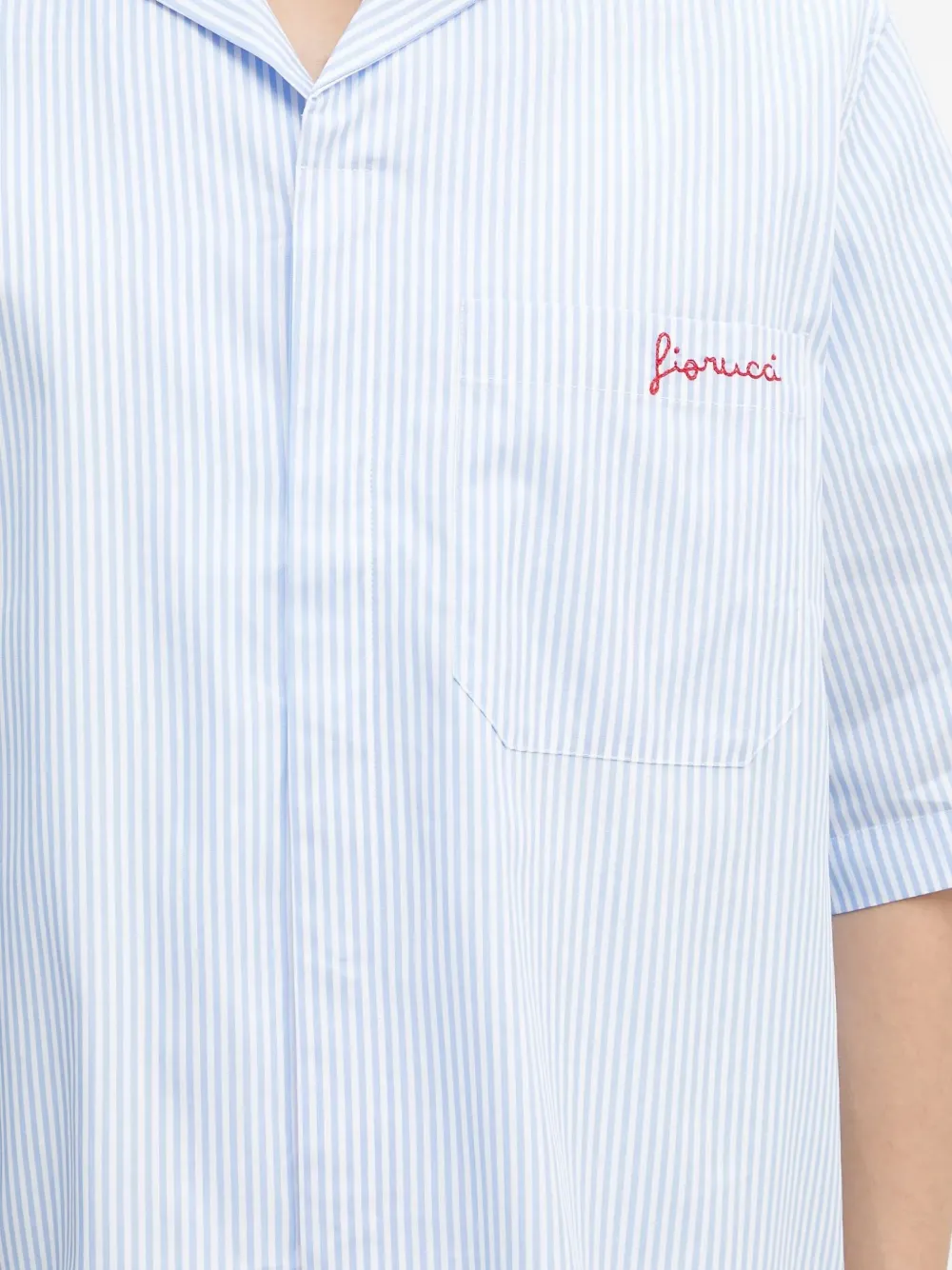 Светло-голубой полосатый узор, короткие рукава, воротник-стойка, вышитый логотип, нагрудный карман