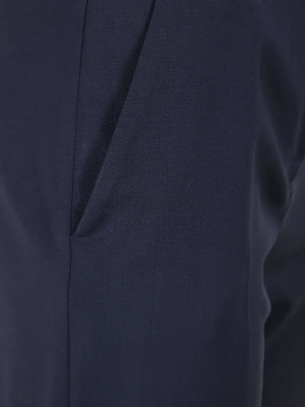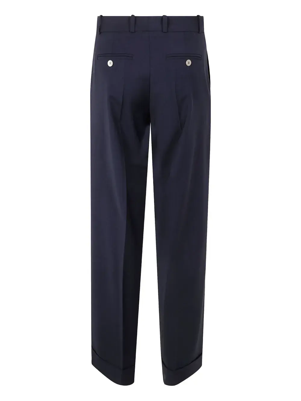Темно-синие заутюженные складки, два передних кармана, два задних прорезных кармана, отделка пуговицами