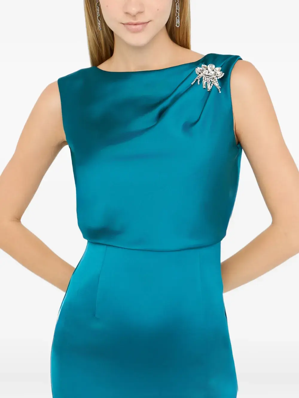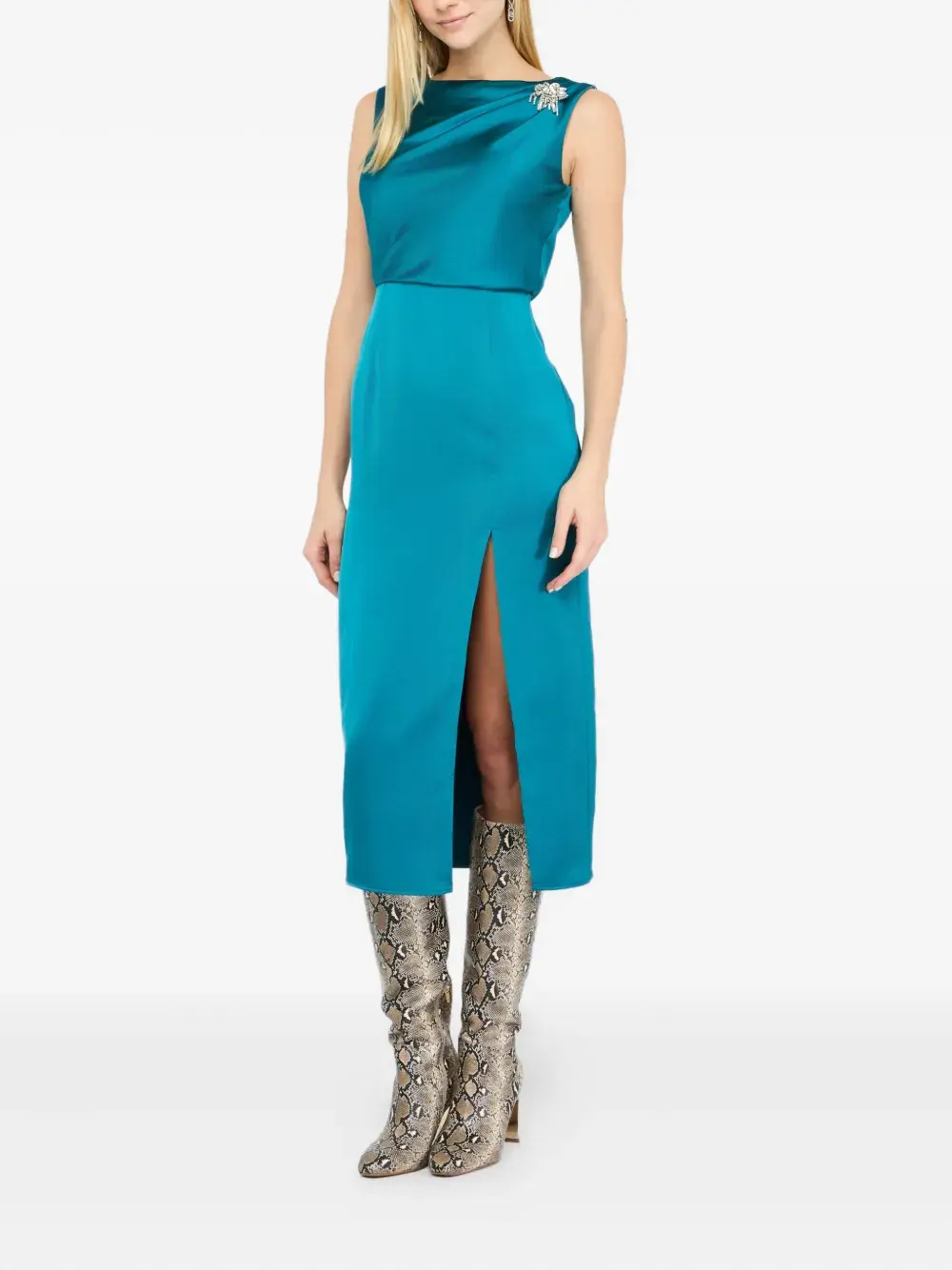 Небесно-голубой вырез «лодочка», отделка стразами на плечах, эластичный пояс, разрез спереди, потайная застежка-молния сзади