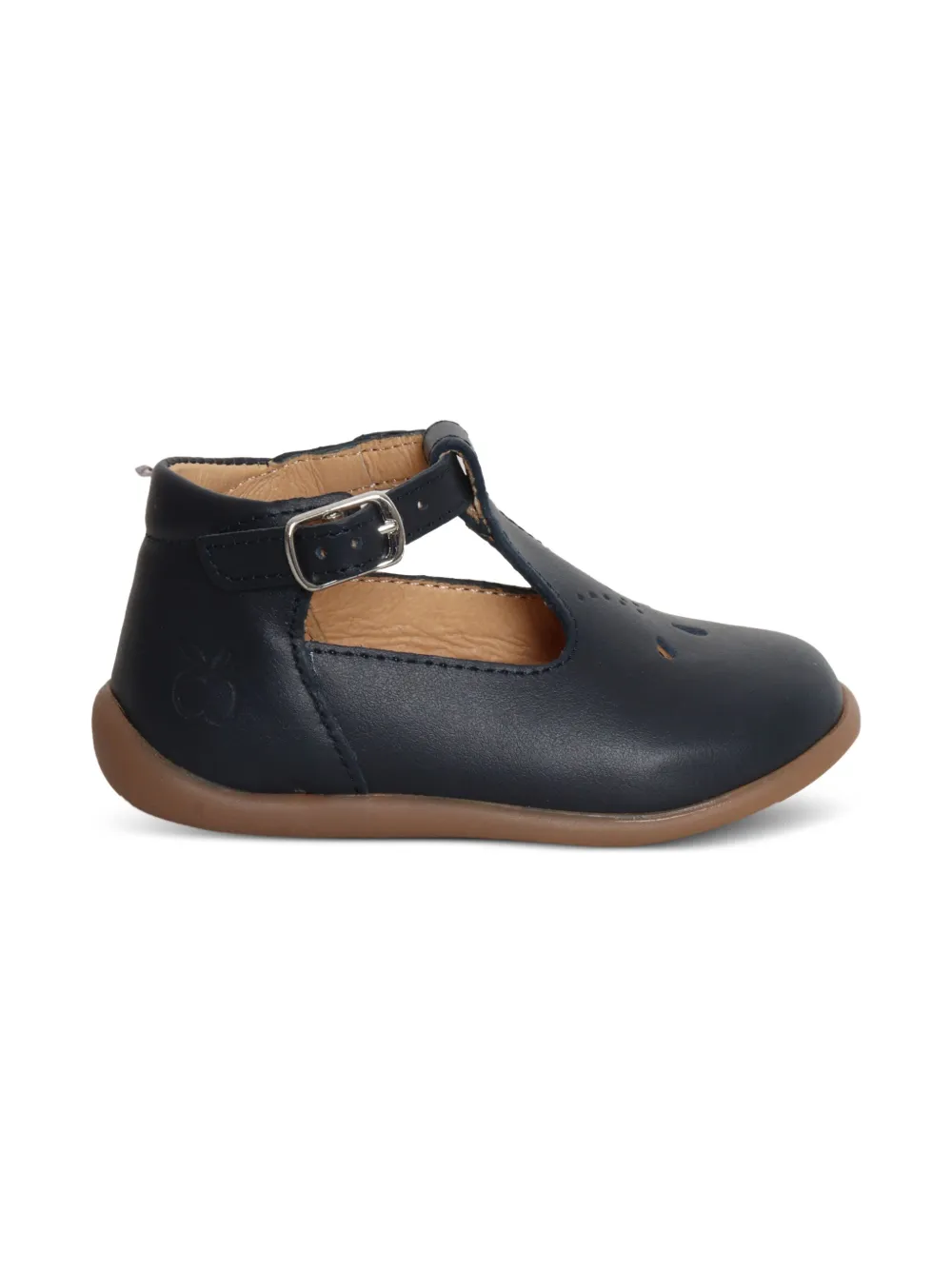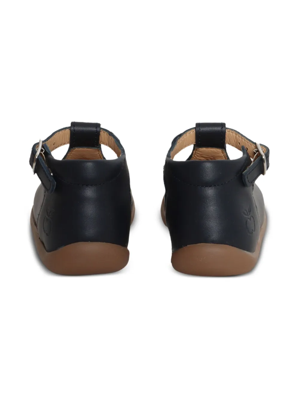 Верх из темно-синей кожи, застежка на пряжку с Т-образным ремешком, перфорированные детали, плоская подошва